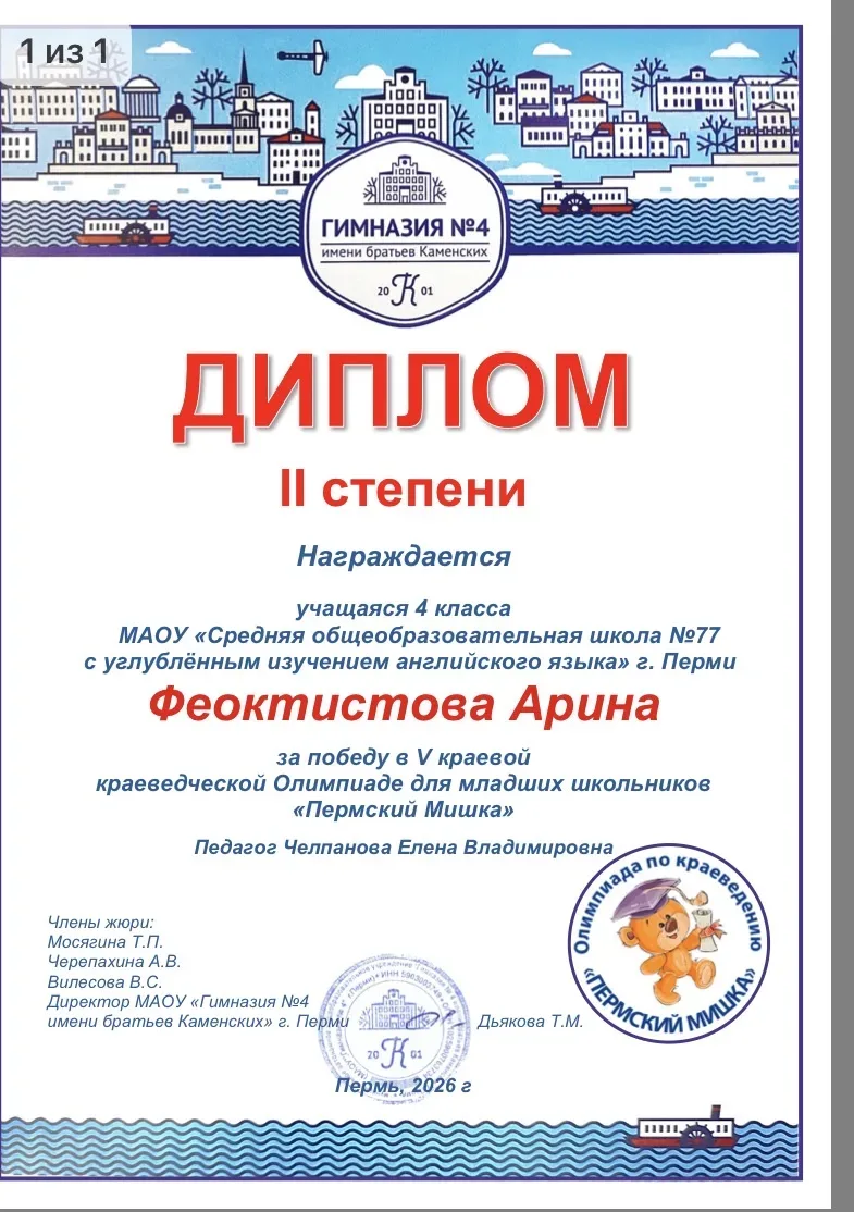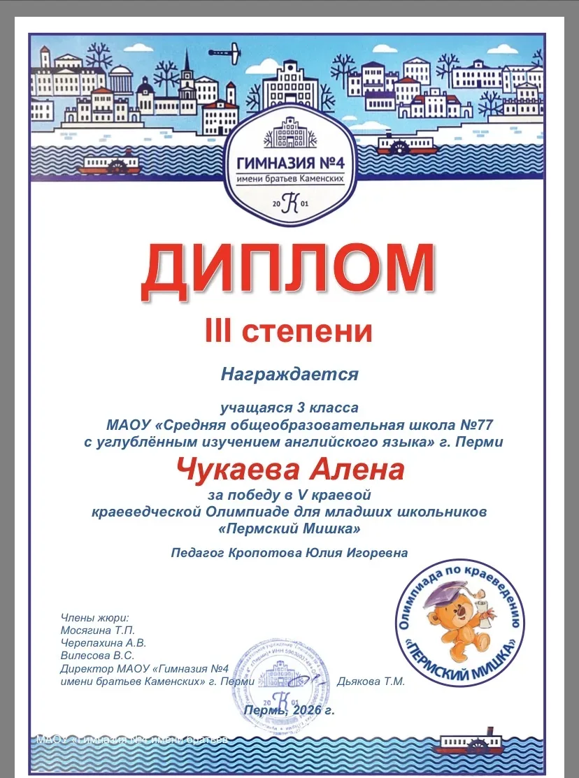 Учащиеся начальной школы активно принимают участие в олимпиадном движении. Очень достойно наши девочки выступили в V краевой краеведческой олимпиаде для младших школьников «Пермский Мишка».