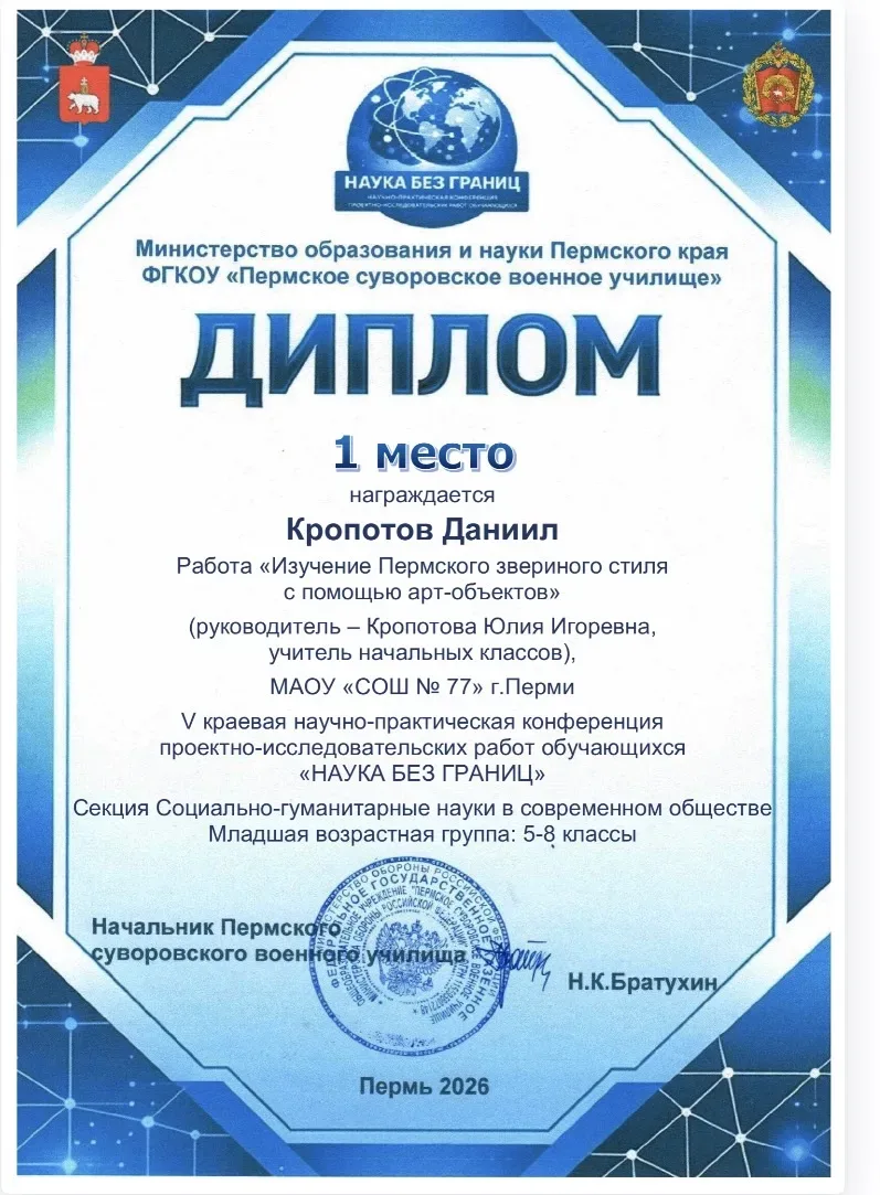 Конференция проходила в Суворовском училище. Данил с работой "Изучение Пермского звериного стиля с помощью арт-объектов" набрал максимальное количество баллов в секции "Социально-гуманитарные науки в современном обществе" и занял 1 место. Желаем дальнейших успехов!