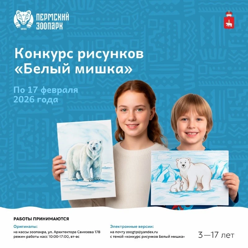 🌟 Оригиналы работы (г. Пермь, ул. Архитектора Свиязева, 17В (кассы), Электронные версии (почта zoogtp@yandex.ru - тема «конкурс рисунков Белый мишка»),