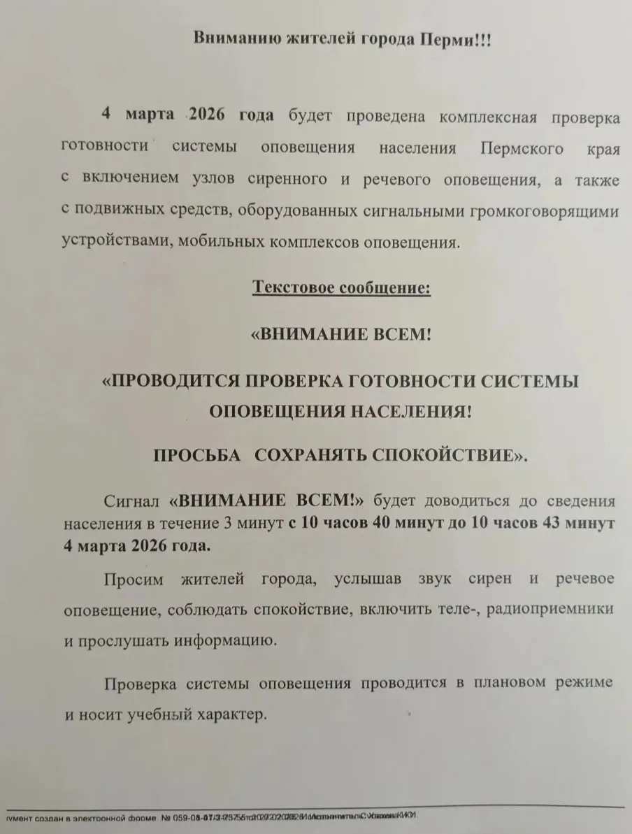 04 марта 2026 года с 10:43 до 10:44 в Пермском крае будет проводиться комплексная проверка готовности систем оповещения.