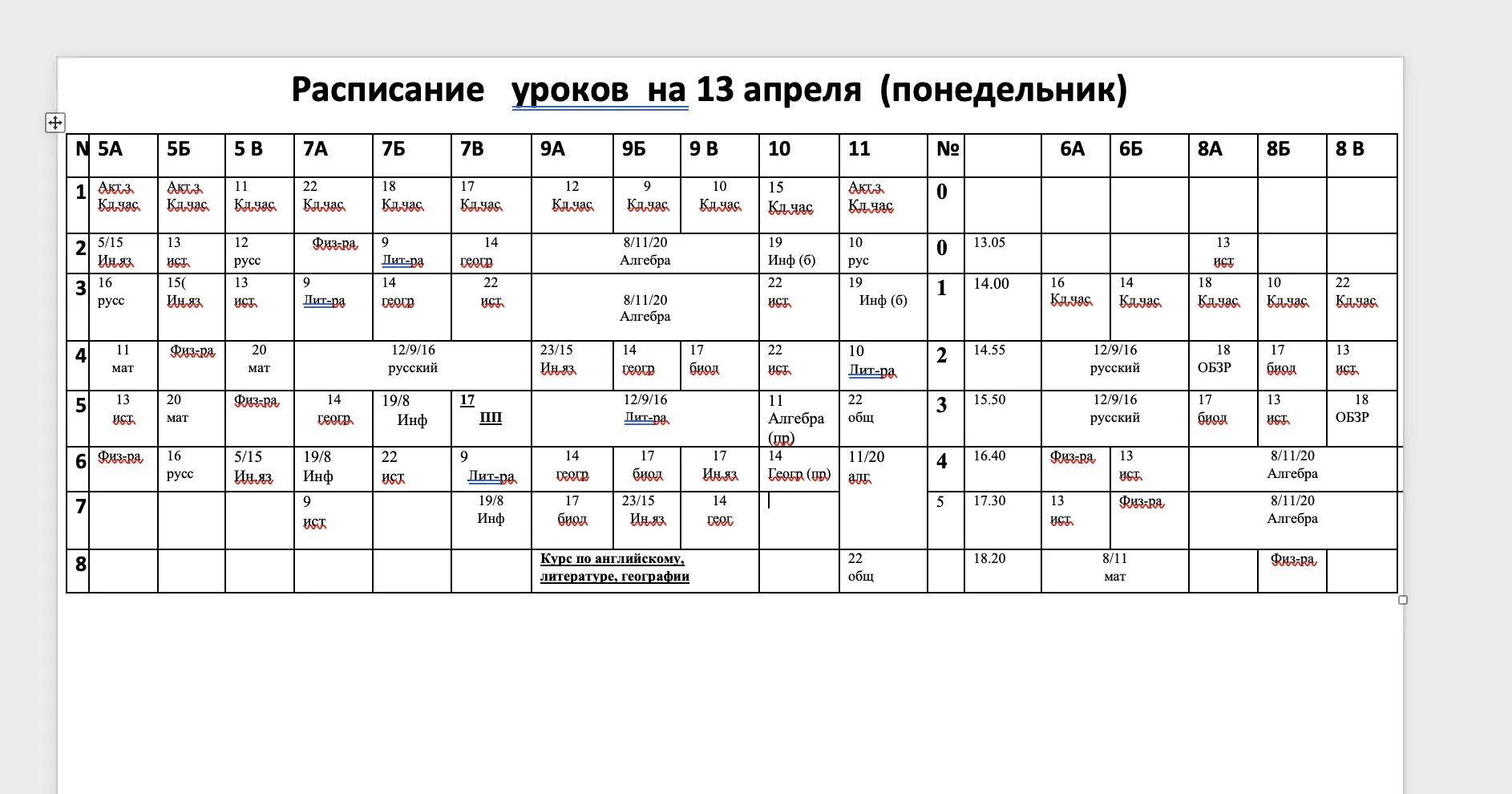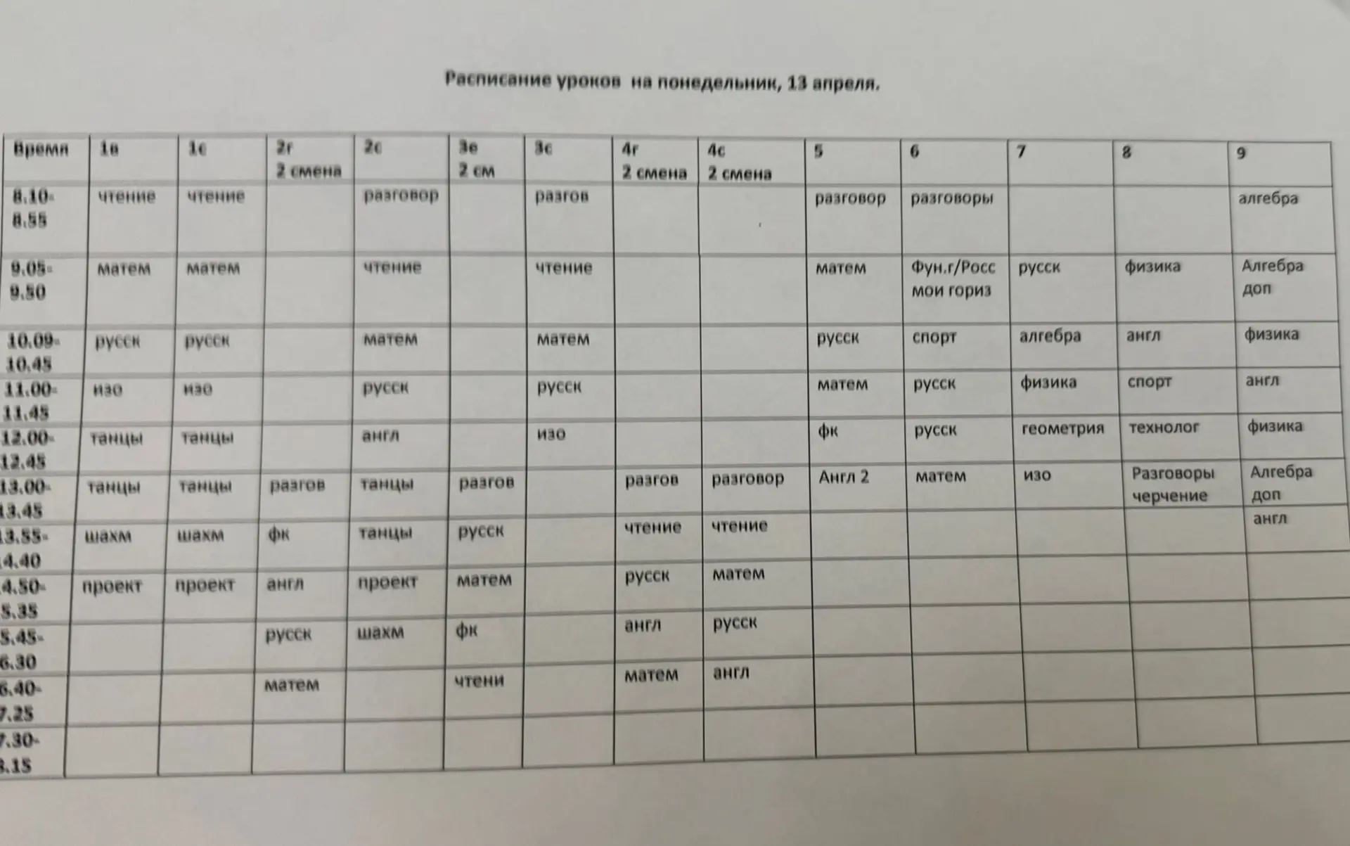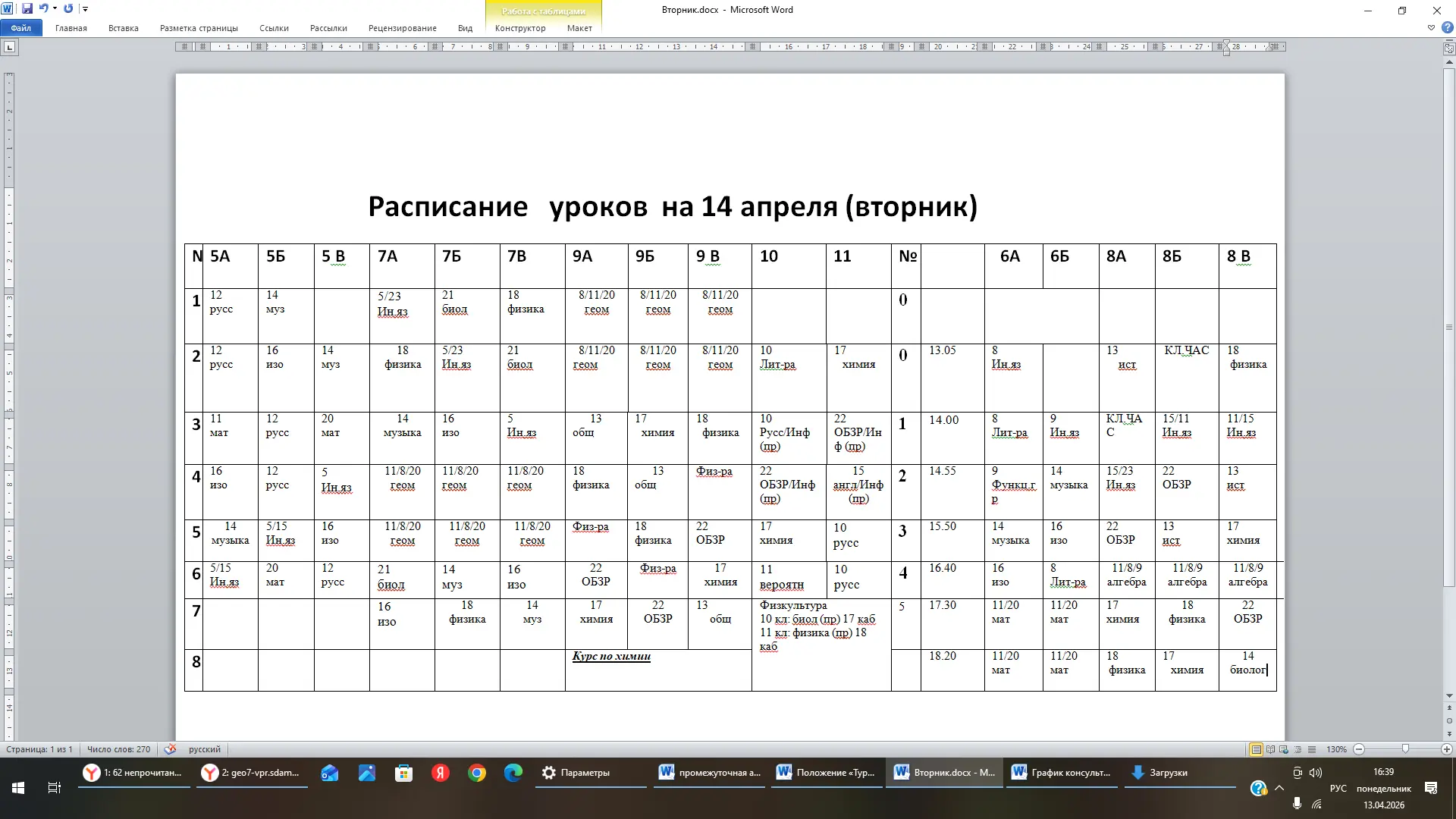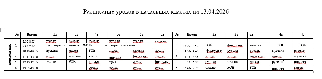 Расписание на 13.04, понедельник