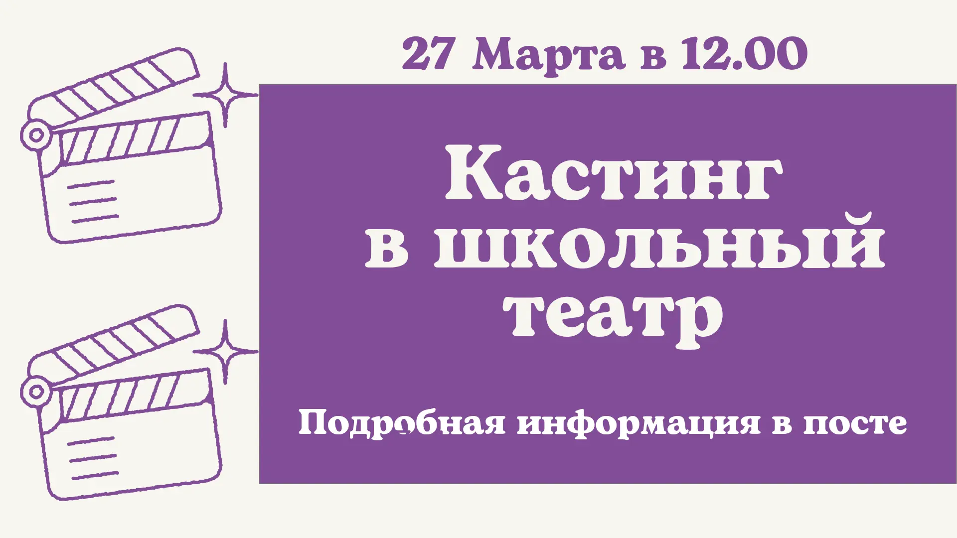 Школьный театр объявляет кастинг (набор) на участие в новой театральной постановке. Мы ищем талантливых и увлечённых ребят, готовых воплотить яркие образы на сцене и подарить зрителям положительные эмоции.