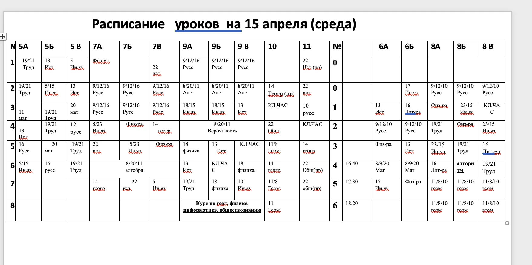 ИЗМЕНЕНИЯ в расписании на 15.04, среда