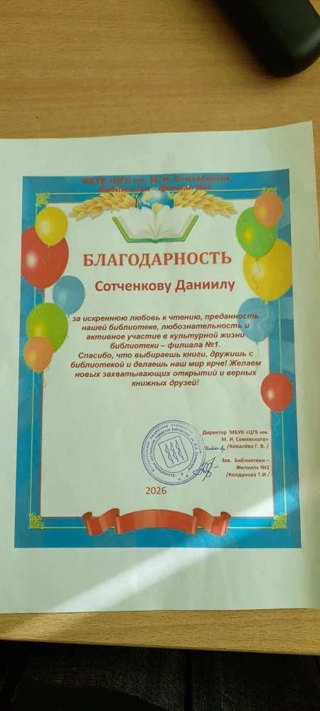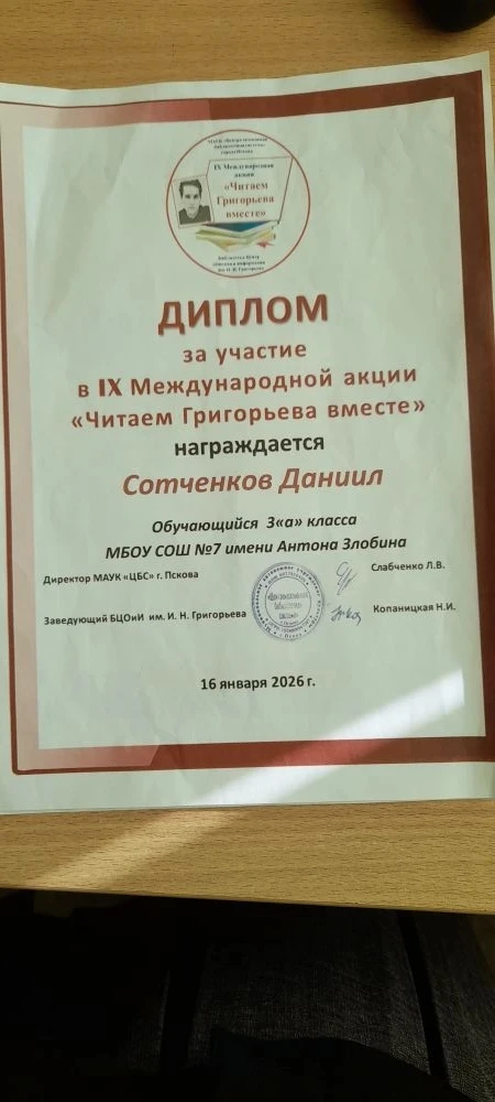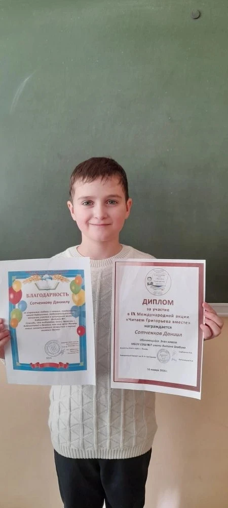 Дипломом за участие в 9 Международной акции "Читаем Григорьева вместе" и благодарностью за искреннюю любовь к чтению и активное участие в культурной жизни городской детской библиотеки - филиала номер 1 награжден ученик 3 а класса Сотченков Даниил. Поздравляем и желаем дальнейших успехов!