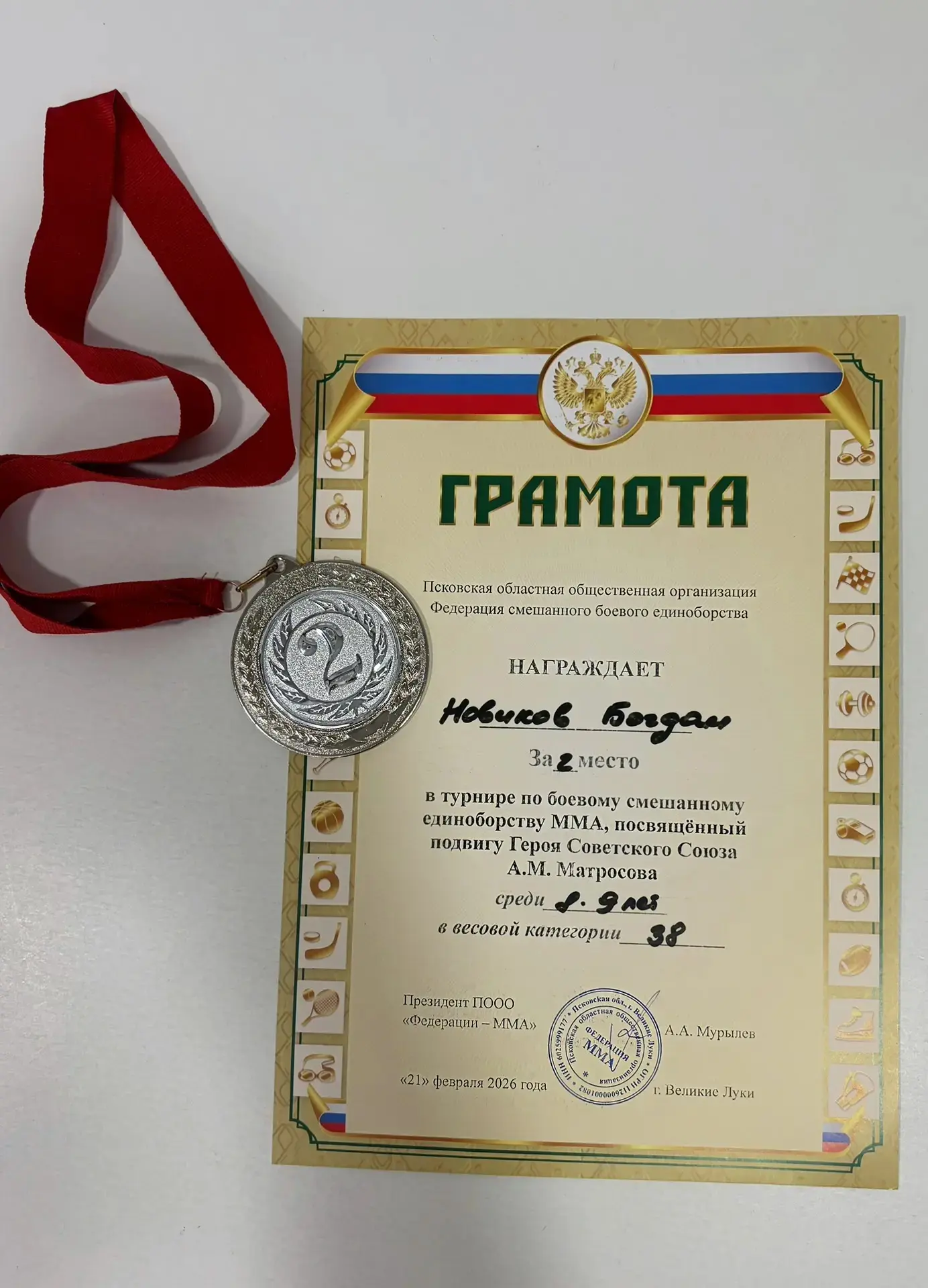 Поздравляем Новикова Богдана ученика 3 а класса с победой в Межрегиональном открытом кубке по смешанному боевому единоборству ММА , посвященному подвигу Героя Советского Союза Александра Матросова .