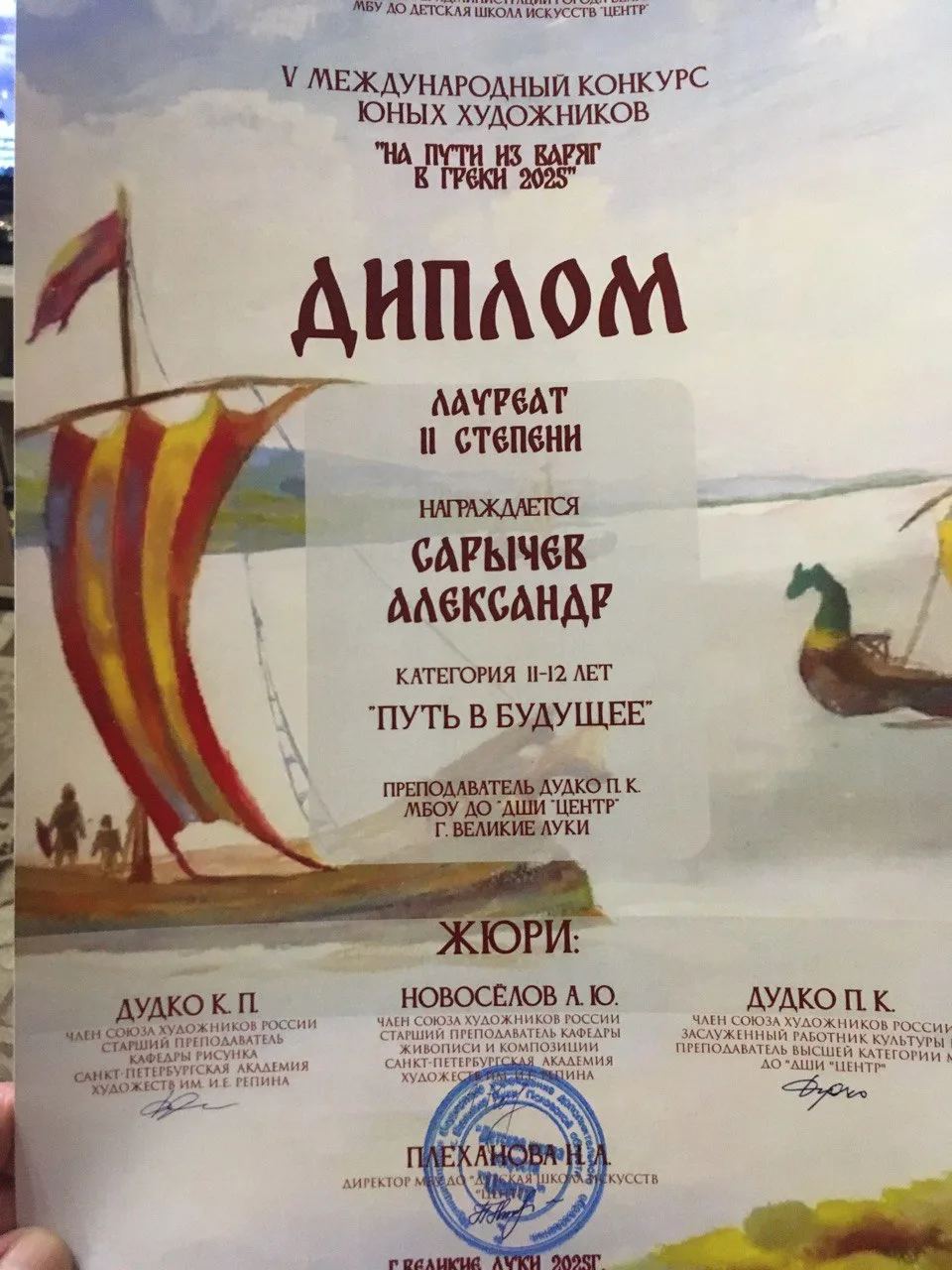 🎨 Ученик 6Д класса нашей школы, Сарычев Александр, принял участие в V Международном конкурсе юных художников "На пути из варяг в греки 2025". По итогам конкурса Александр завоевал звание лауреата II степени!