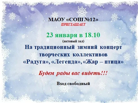 Коллектив МАОУ СОШ №12 с глубоким прискорбием сообщает, что 15 января 2026 года на 72 году ушла из жизни ветеран педагогического труда, "Почетный работник общего образования Российской Федерации", талантливый учитель немецкого языка Смирнова Любовь Васильевна. Учитель с большой буквы, она дала знания сотням благодарных учеников. Более 40 лет Любовь Васильевна несла знания в сочетании с душевной теплотой, материнской заботой.