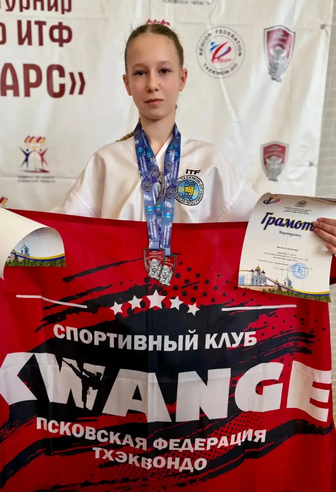 🔴Басова Александра (9 А класс) — стала призёром регионального турнира по тхэквондо ИТФ «Псковский барс»: 🥇 первое место в формальном комплексе и 🥉 третье место в спарринге.