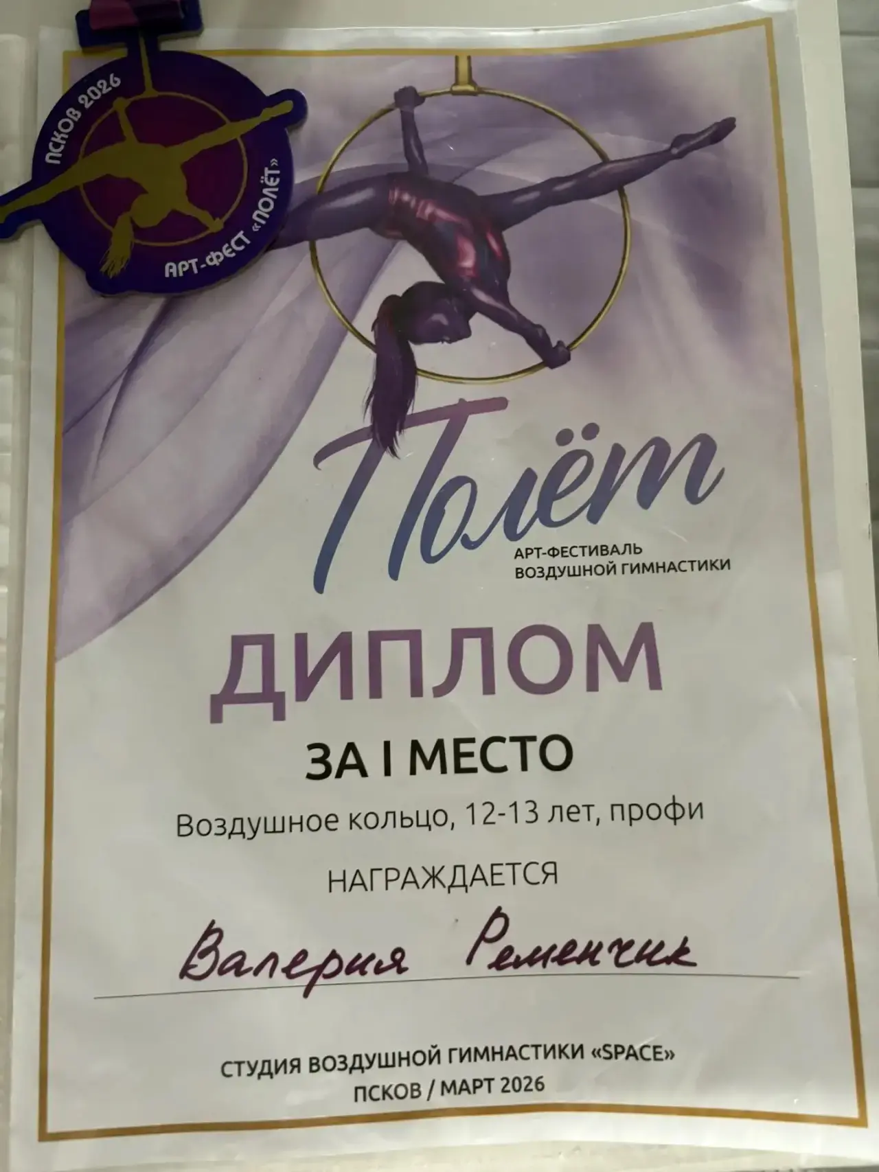 🤸Ременчик Валерия (7 «Б») завоевала диплом 1 степени на арт-фестивале воздушной гимнастики «Полёт».