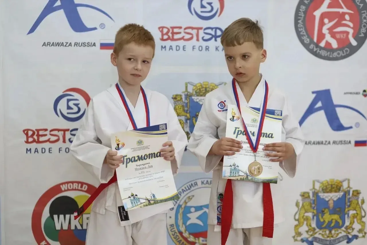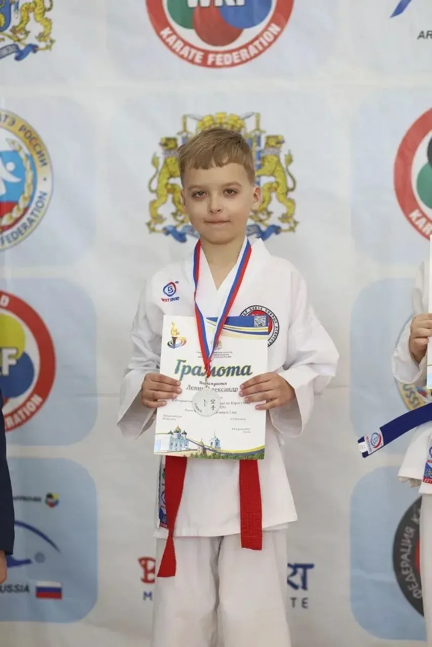 🥋Левин Александр стал призёром по каратэ в Пскове: 2 место в ката и 3 место в кумитэ среди мальчиков 6–7 лет.