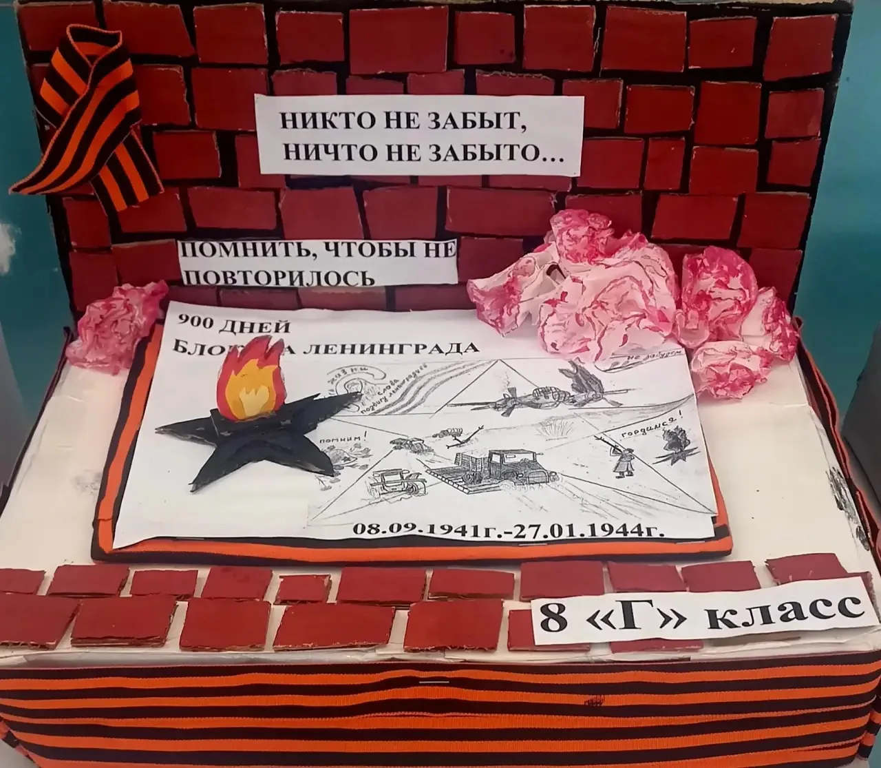 ✂️ Символы стойкости: Поделки и макеты, изображающие Дорогу жизни, блокадную ласточку, пробитый снарядом лист дневника Тани Савичевой.