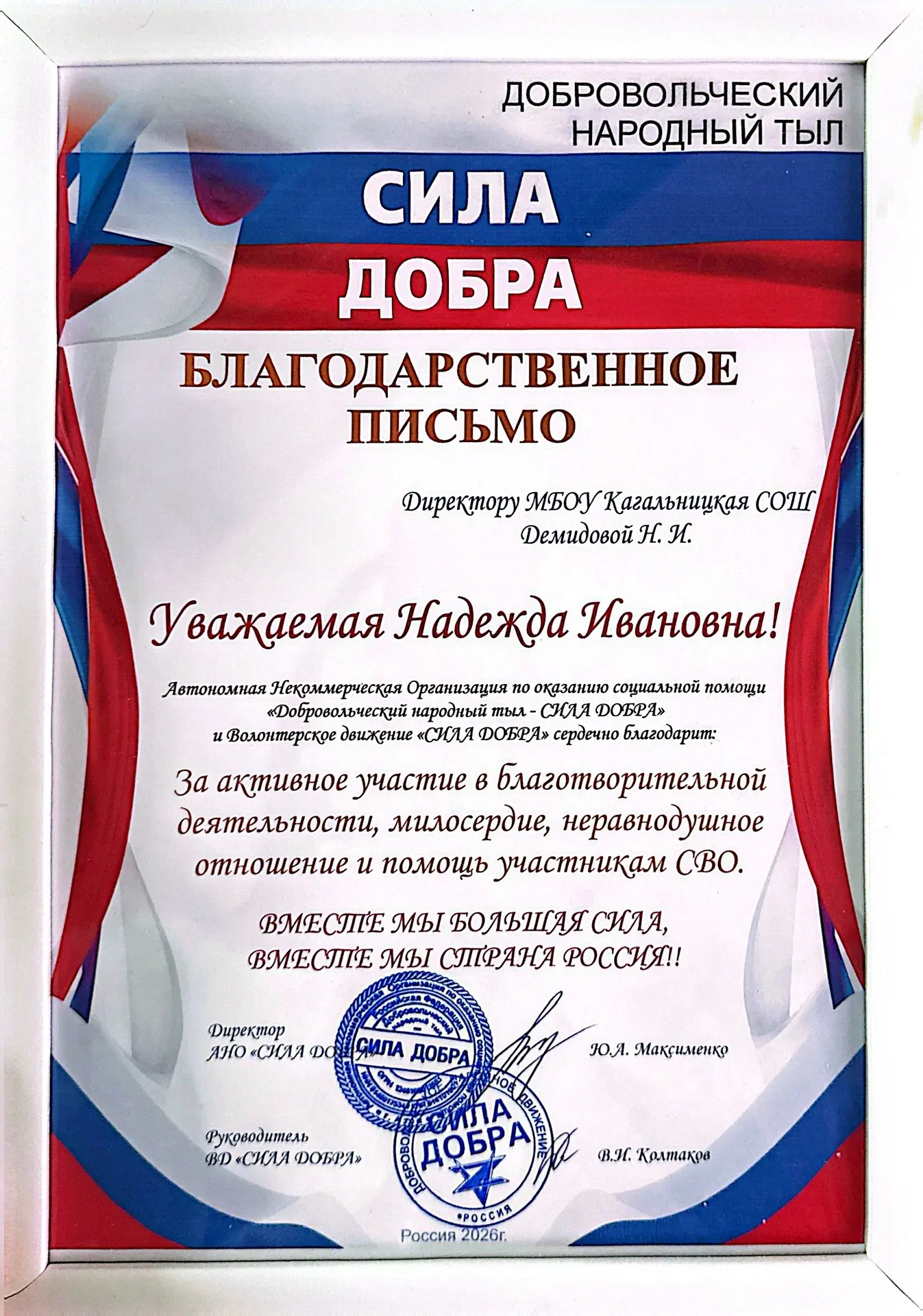 В рамках мероприятия, директор МБОУ Кагальницкой СОШ Демидова Надежда Ивановна, была удостоена почетной награды. Ей было вручено благодарственное письмо от директора АНО «Сила добра» Максименко Ю.А. и руководителя ВД «Сила добра» В.И. Колтакова.