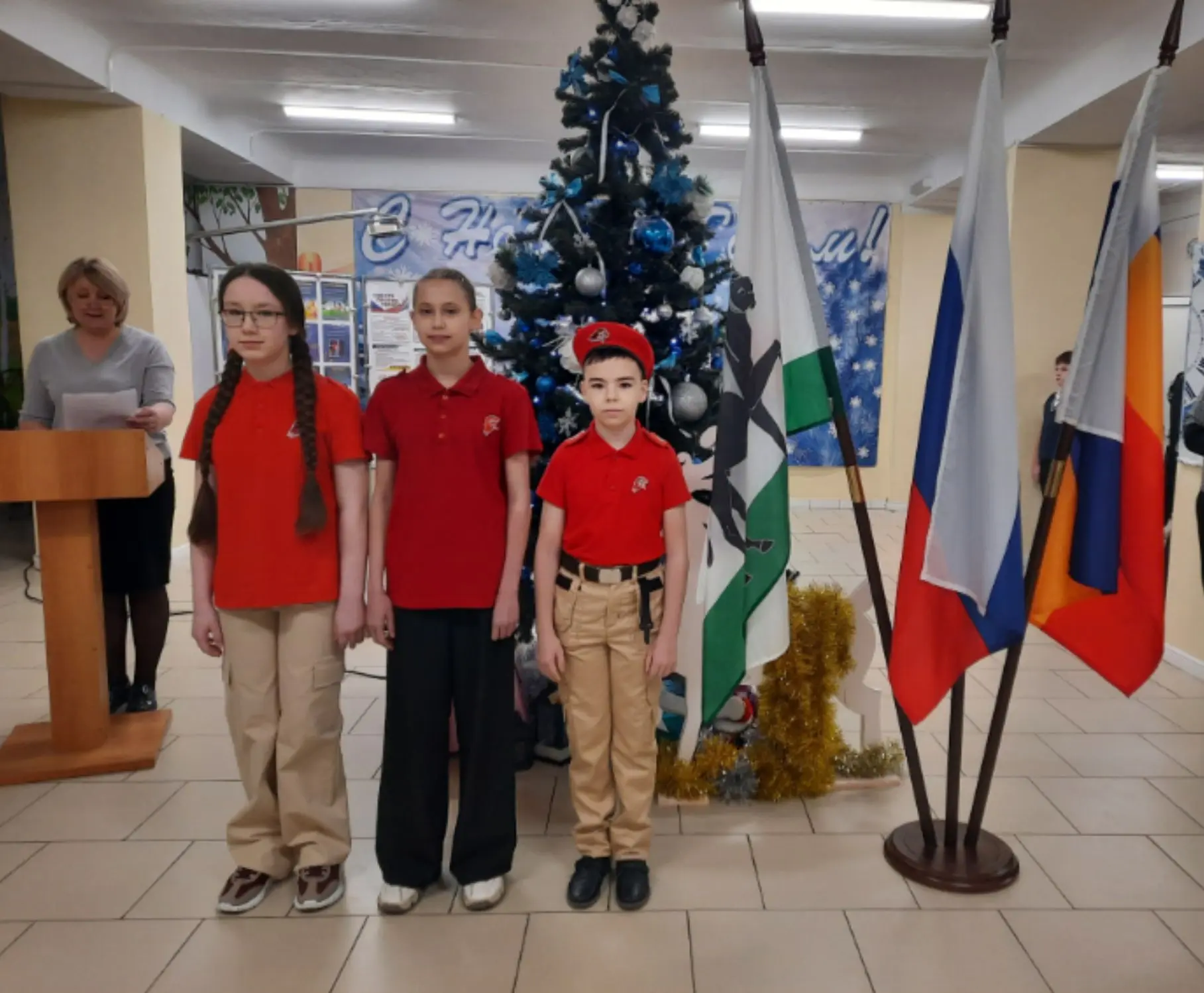 После исполнения гимна право внести и установить флаг Российской Федерации было предоставлено ученикам 6-б класса.