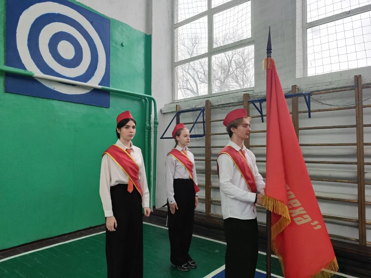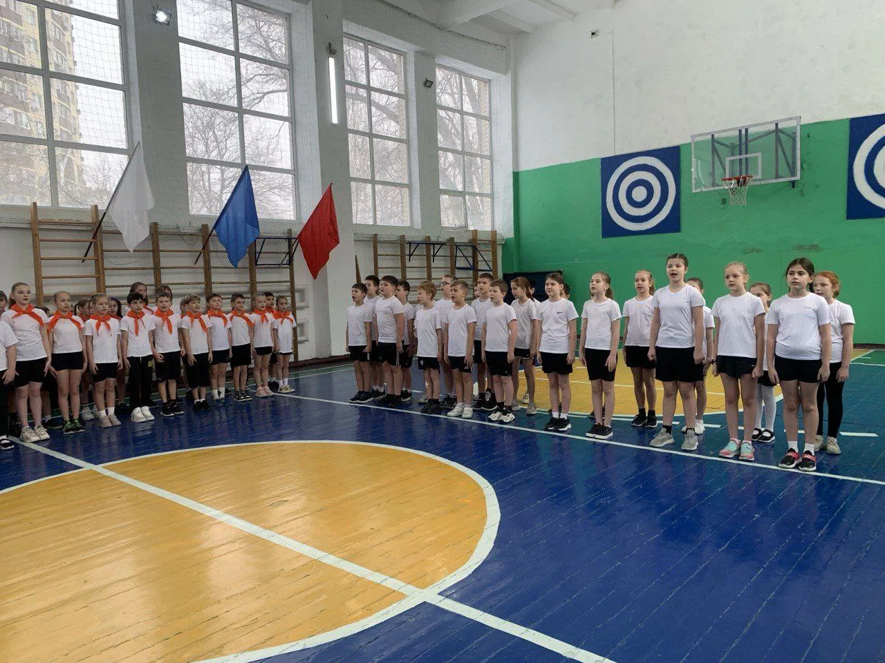 Новая четверть началось с Поднятия Флага и школьного Знамени и исполнения Гимна РФ