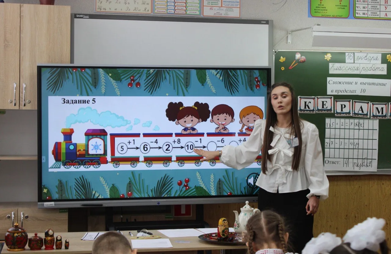 Молодой преподаватель начальных классов школы №16 Нина Савельева показала урок математики в первом классе с элементами финансовой грамотности. Ребята закрепляли устный и письменный счет, отрабатывали навыки сложения и вычитания в пределах десятка. Учитель построила занятие в форме путешествия на экспрессе с остановками в городах и поселках с развитыми народными промыслами. На каждой станции дети выполняли разнообразные задания, часть которых была связана со счетом денег. В каждом пункте они покупали подарки для Деда Мороза и получали «денежное» вознаграждение за верно выполненное решение. Также распределяли монеты и купюры разного номинала по форме и цвету. Урок получился ярким, динамичным, эмоциональным.