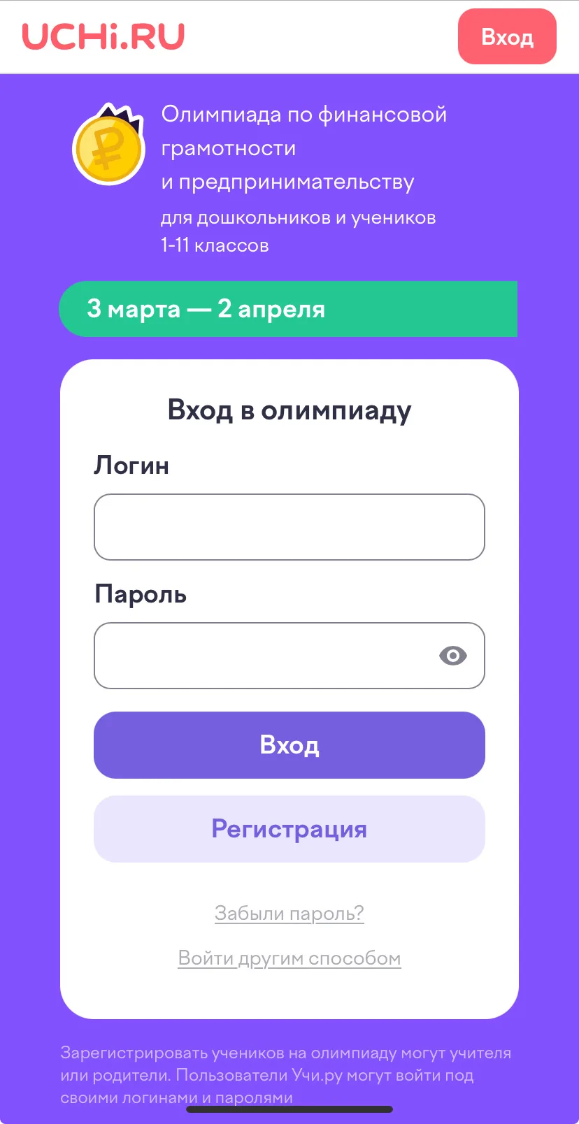Ну Учи.ру проходит бесплатная всероссийской онлайн-олимпиада по финансовой грамотности и предпринимательству, в которой могут принять участие дошкольники и ученики 1–11 классов. Состязание проводится в рамках Стратегии повышения финансовой грамотности до 2030 года и национального проекта «Эффективная и конкурентная экономика» при поддержке портала «Мои финансы». Партнеры — Банк России, Министерство финансов Российской Федерации и Министерство экономического развития Российской Федерации.
