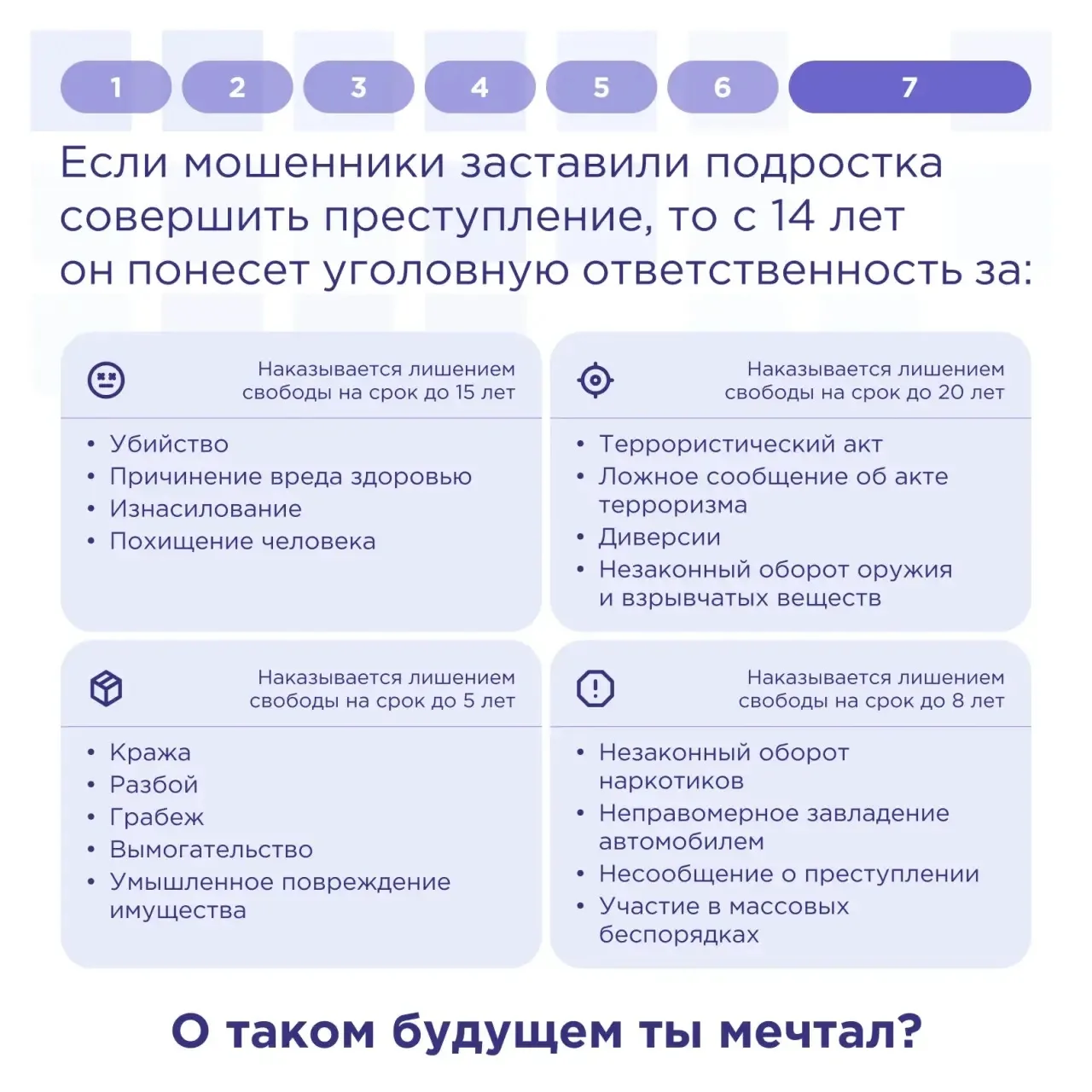 Злоумышленники могут использовать разные методы, чтобы заманить вас и детей в свои сети: обманы, уговоры, игры, обещания. Не позволяйте себя втянуть в то, что может разрушить вашу жизнь.