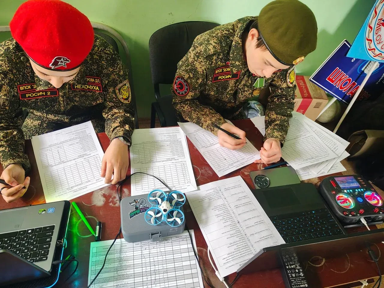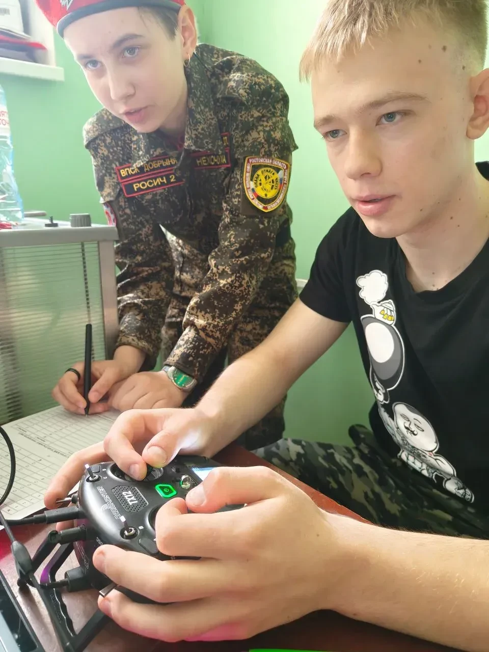 Юнармейцы отряда МБОУ СОШ №2, воспитанники военно-патриотического спортивного клуба «Добрыня» Вчерашнев Евгений и Краснопёрова Дарья, в течение двух дней работали на площадке в роли инструкторов и помощников судей в дисциплине «Состязание операторов БПЛА» для средней и старшей возрастных категорий. На них была вся рабочая часть: подготовка трассы на симуляторе, настройка оборудования, помощь участникам и контроль соблюдения правил на всех этапах.