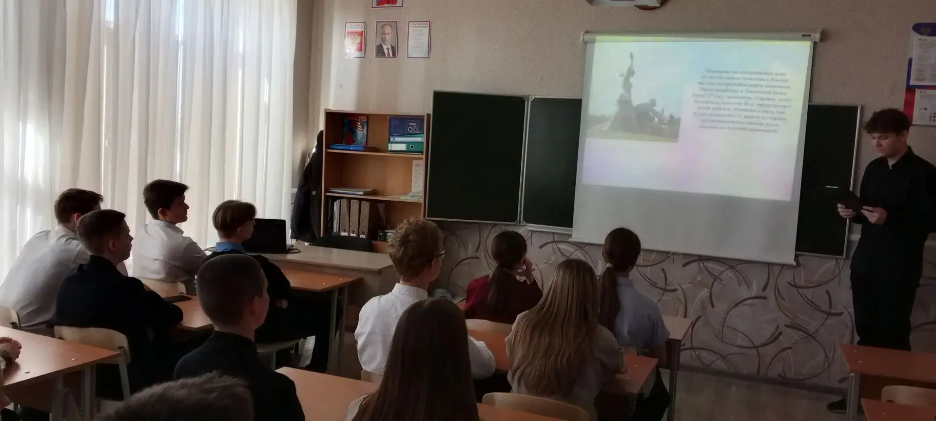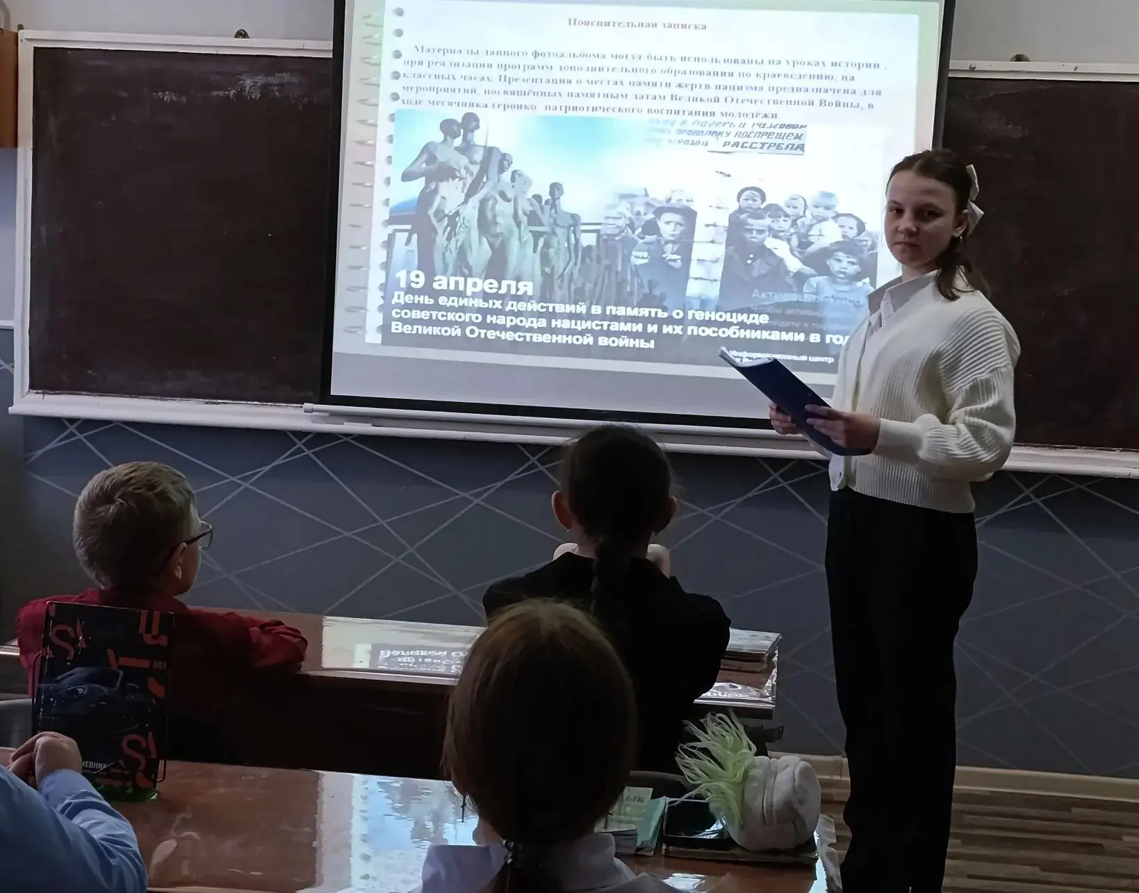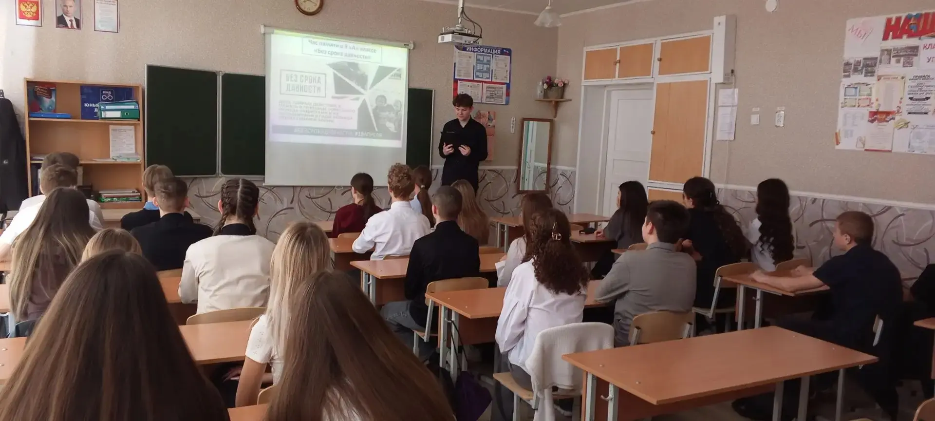 С целью формирования у молодежи понимания необходимости сохранения исторической правды, памяти и преемственности поколений на примере истории геноцида мирных советских граждан со стороны нацистов и их пособников в годы Великой Отечественной войны 1941–1945 годов в 9А классе прошёл час памяти «Без срока давности». Ребята познакомились с важнейшими фактами преступлений против мирных советских граждан со стороны нацистов и их пособников в годы Великой Отечественной войны и мирного населения в нынешнее время.