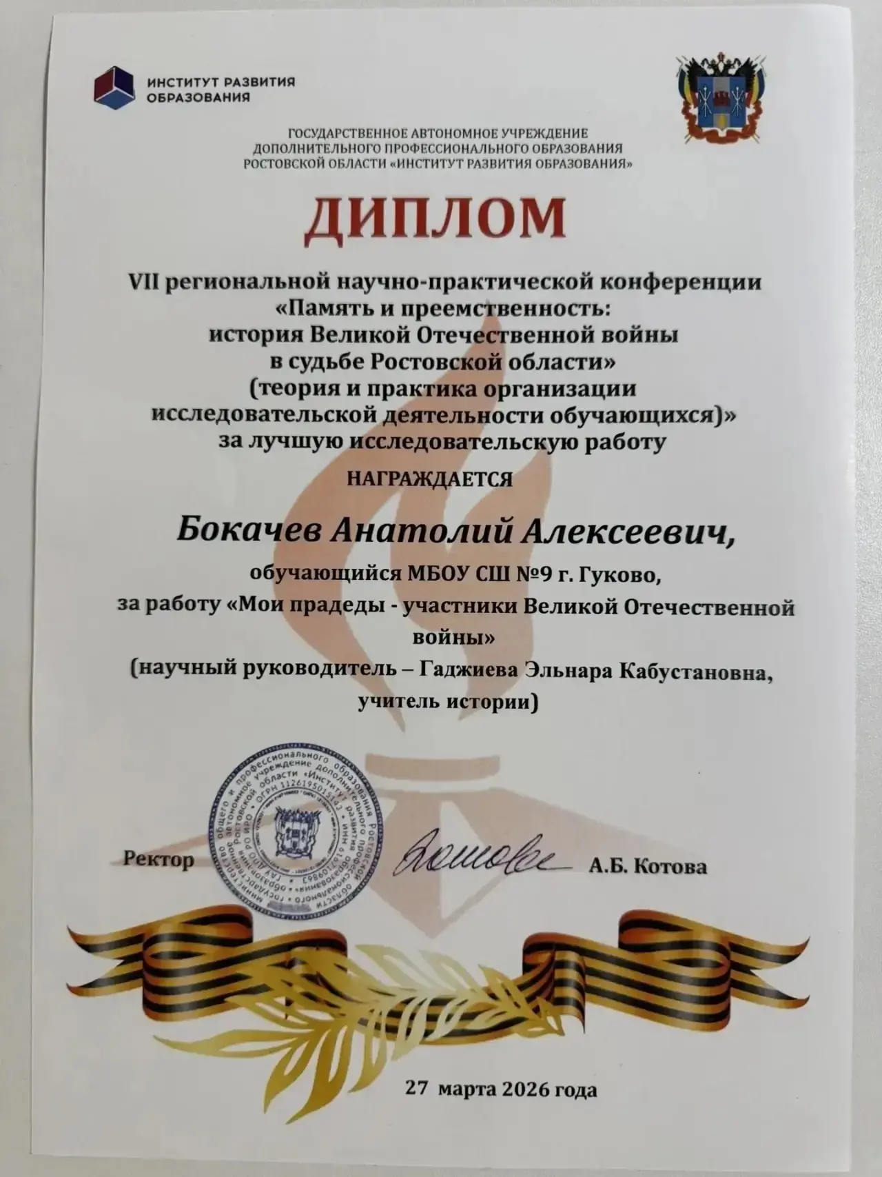 история Великой Отечественной войны в судьбе Ростовской области» (теория и практика организации исследовательской деятельности обучающихся)» и был награжден дипломом за лучшую исследовательскую работу «Мои прадеды - участники Великой Отечественной войны», научный руководитель - учитель истории Гаджиева Эльнара Кабустановна.