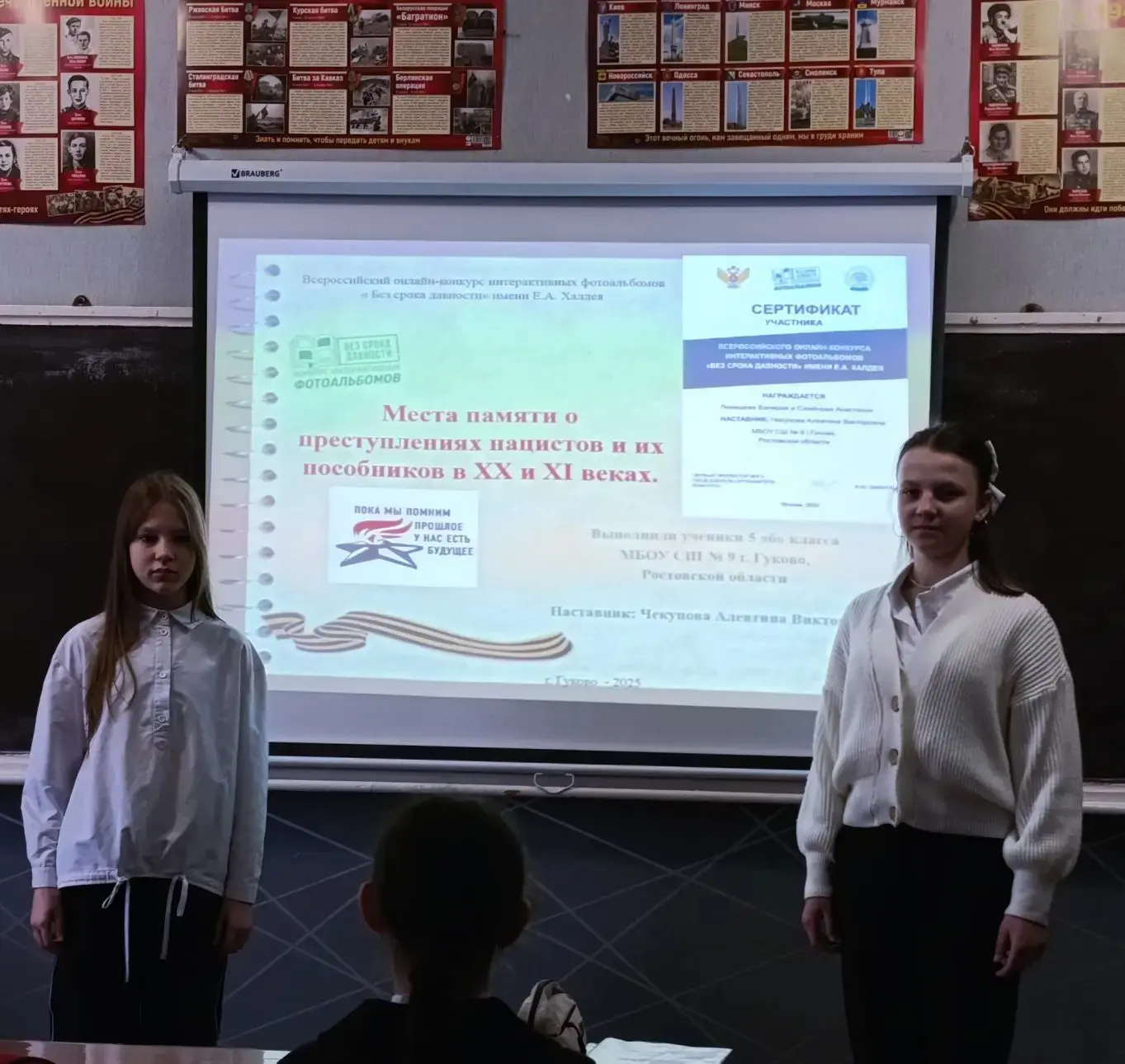Ежегодно в апреле проходит декада дня единых действий против геноцида мирного населения в военное время. Ученицы 6-б класса Семёнова Анастасия и Левищева Валерия, принявшие участие во Всероссийском конкурсе интерактивных проектов "Без срока давности" имени Е. А. Халдея в номинации🔥 "Места памяти о жертвах преступлений украинских нацистов и их пособников в XX - XI веках", представили свой проект с целью сохранения исторической памяти🎖️