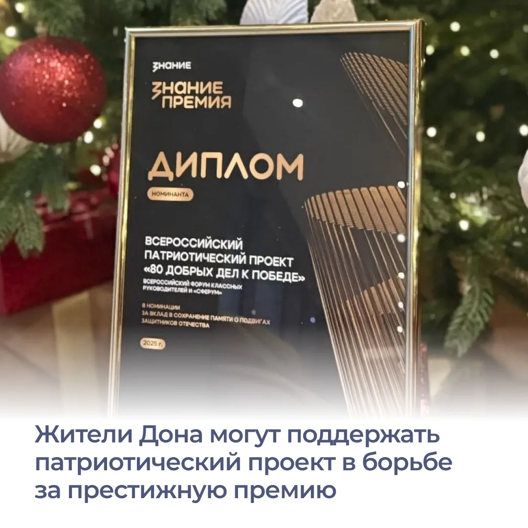 За награду «Знание.Премия – 2025» борется Всероссийский патриотический проект «80 добрых дел к победе». Сейчас он входит в топ-10 номинантов. А один из организаторов проекта – учитель из города Шахты Алексей Удот.