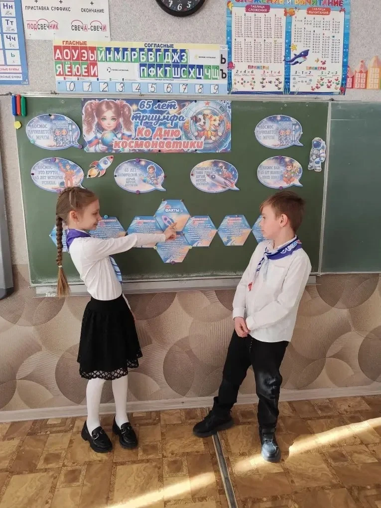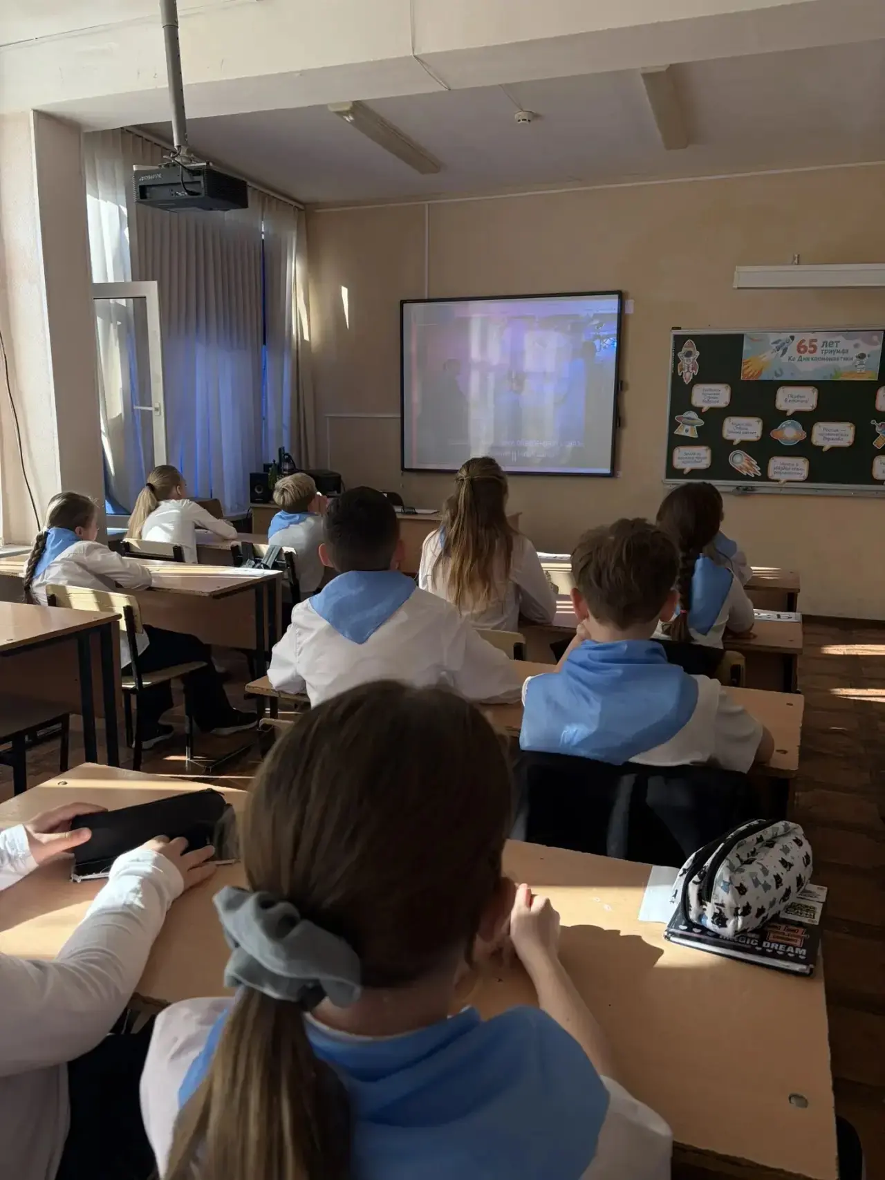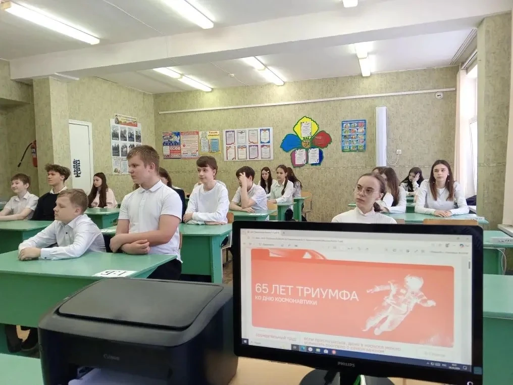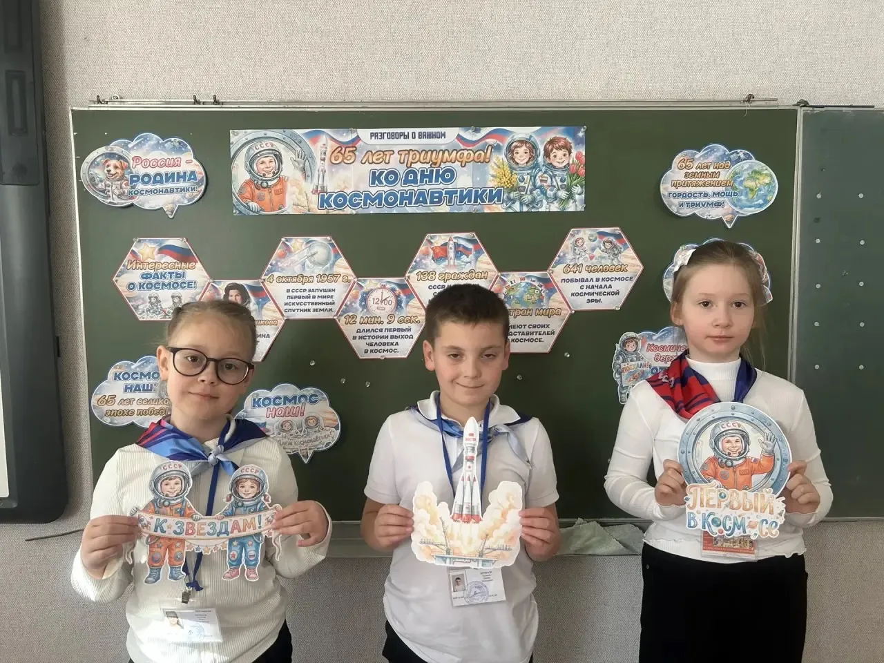 После линейки педагоги провели для ребят традиционное занятие из цикла «Разговоры о важном» на тему: «65 лет триумфа. Ко Дню космонавтики»🚀.