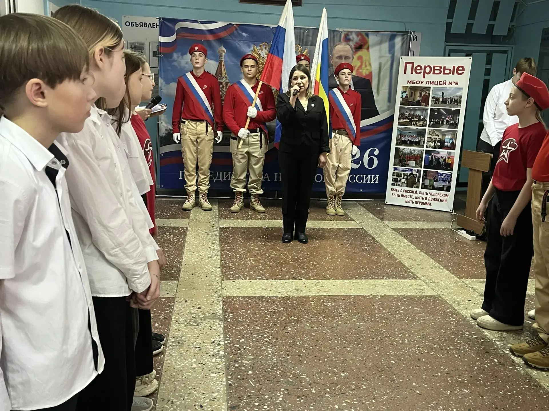 ✨Утро понедельника 2 февраля 2026 года в лицее №5 традиционно началось с торжественной линейки, церемонии выноса флага и исполнения гимна Российской Федерации.
