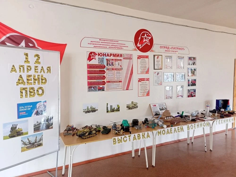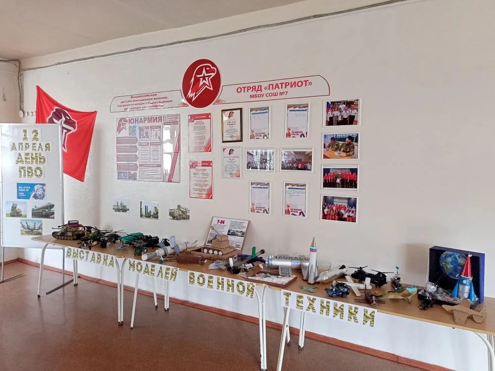 В преддверии праздничного дня в нашей школе №7 была организована выставка стендовых моделей космической и военной техники ПВО.