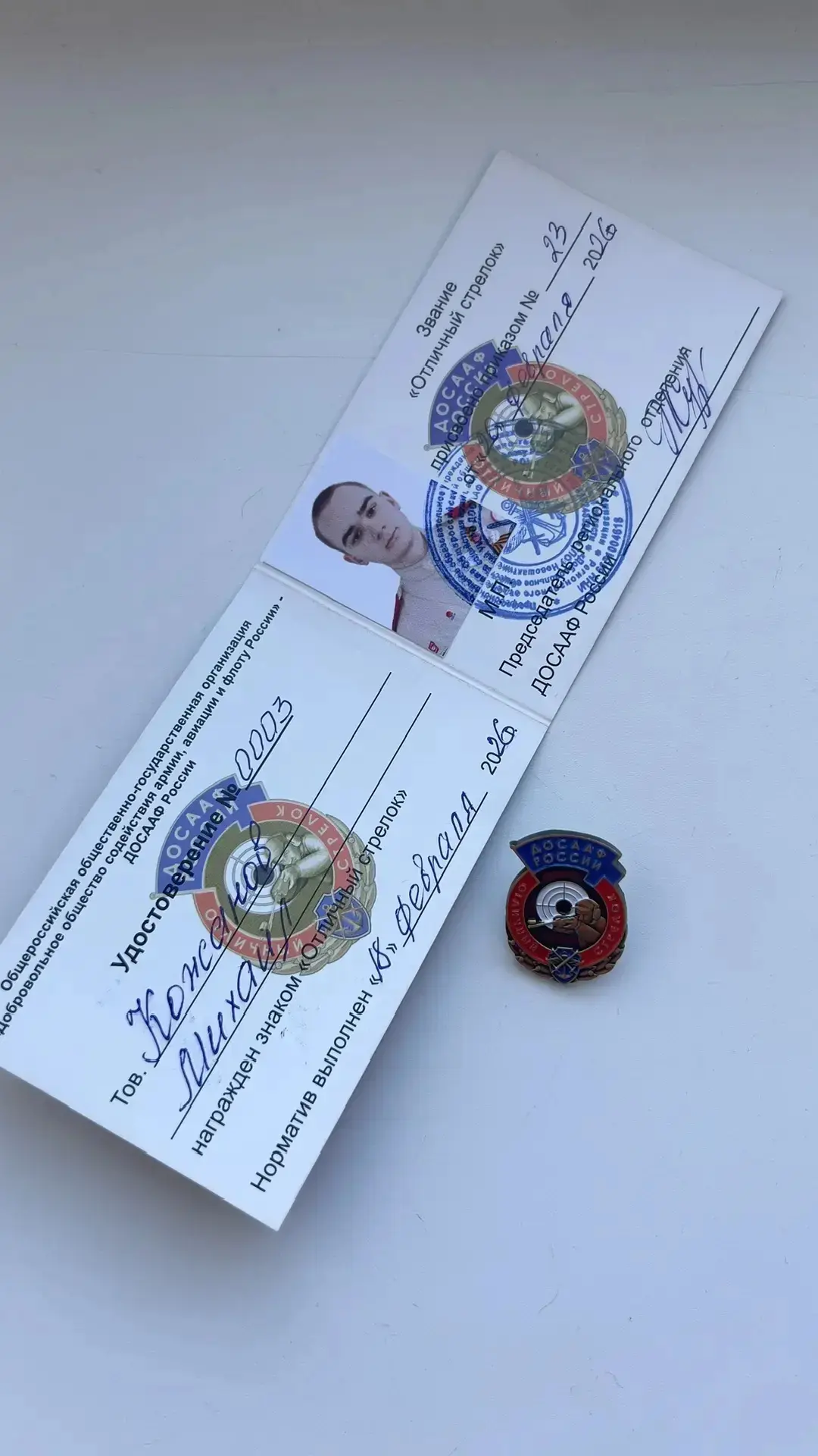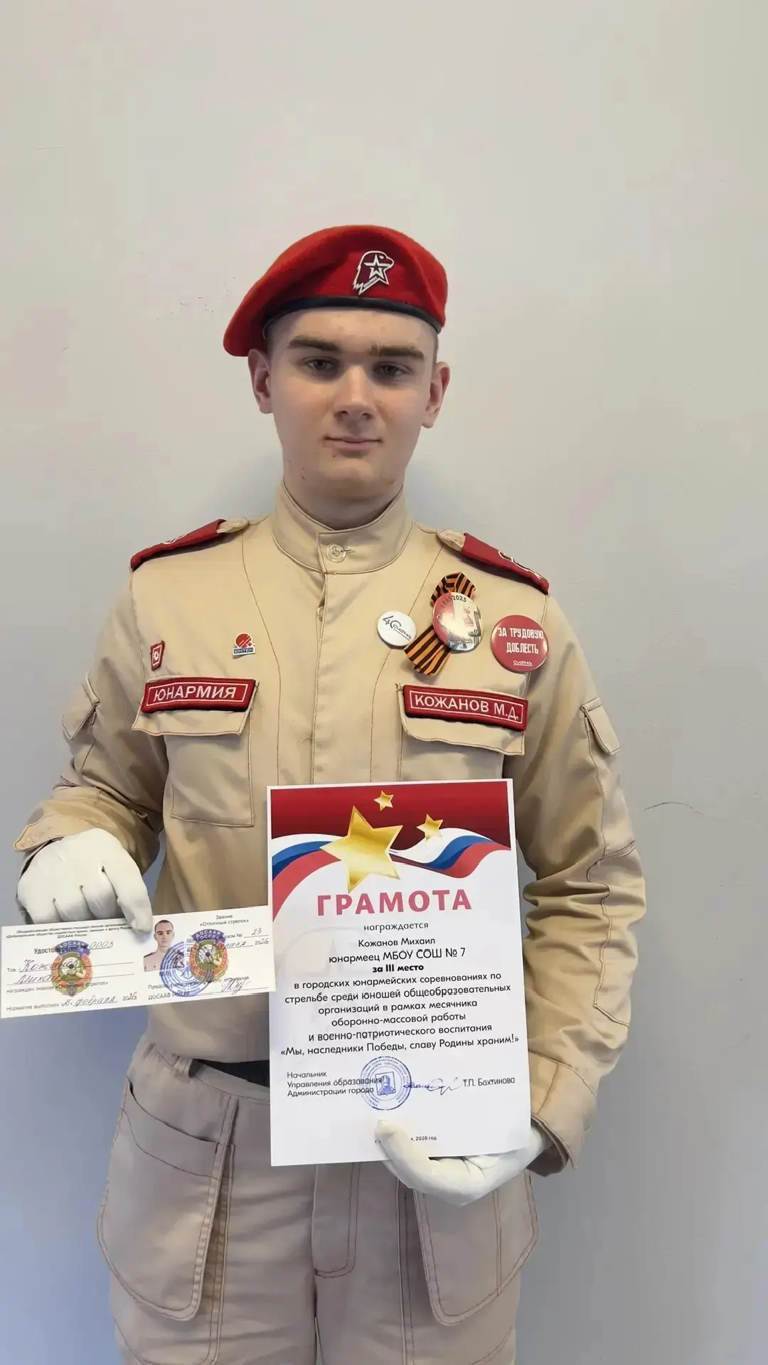 ✨🥉👏Юнармеец отряда "Патриот" Кожанов Михаил награждён грамотой за lll место в городских юнармейский соревнованиях по стрельбе среди юношей, удостоверением и знаком отличия "Лучший стрелок" от ДОСААФ России.