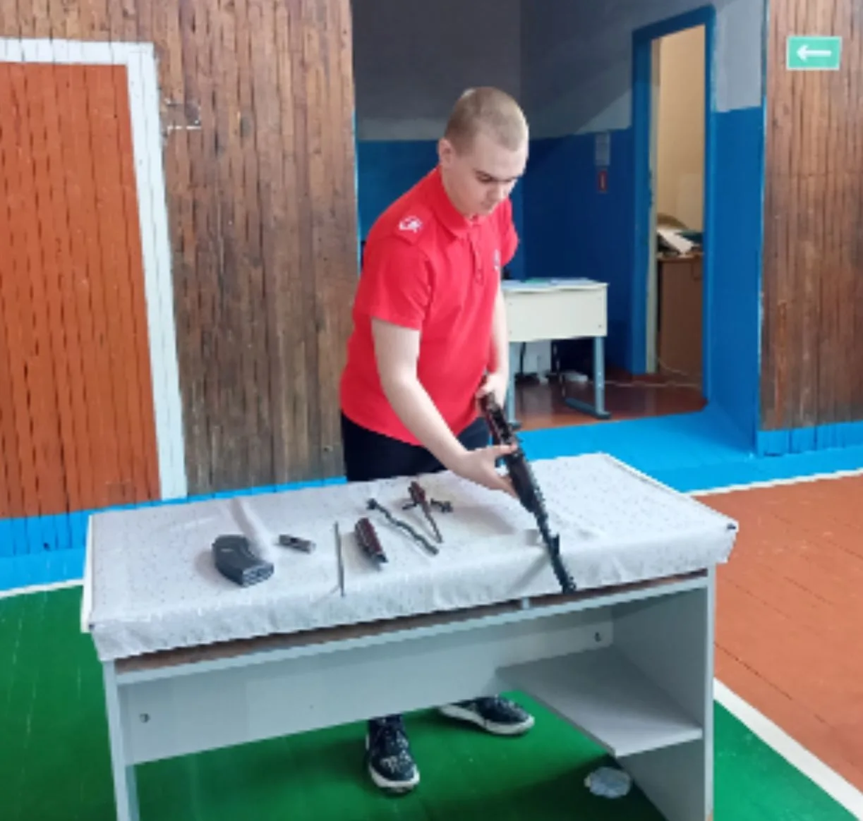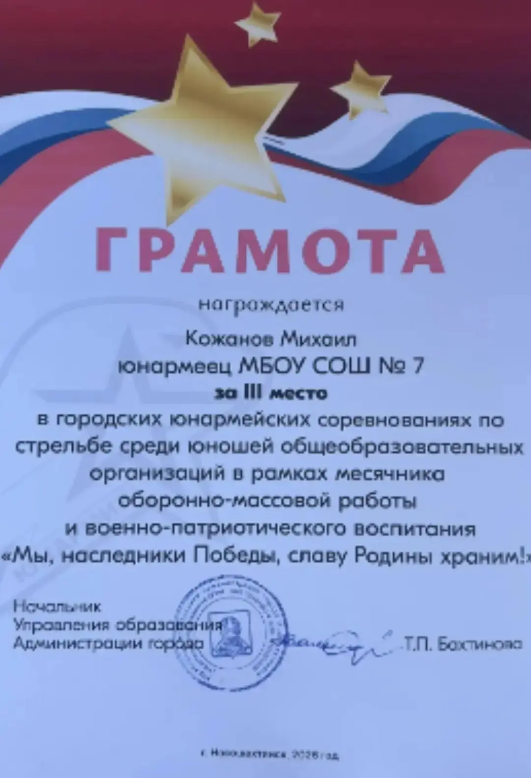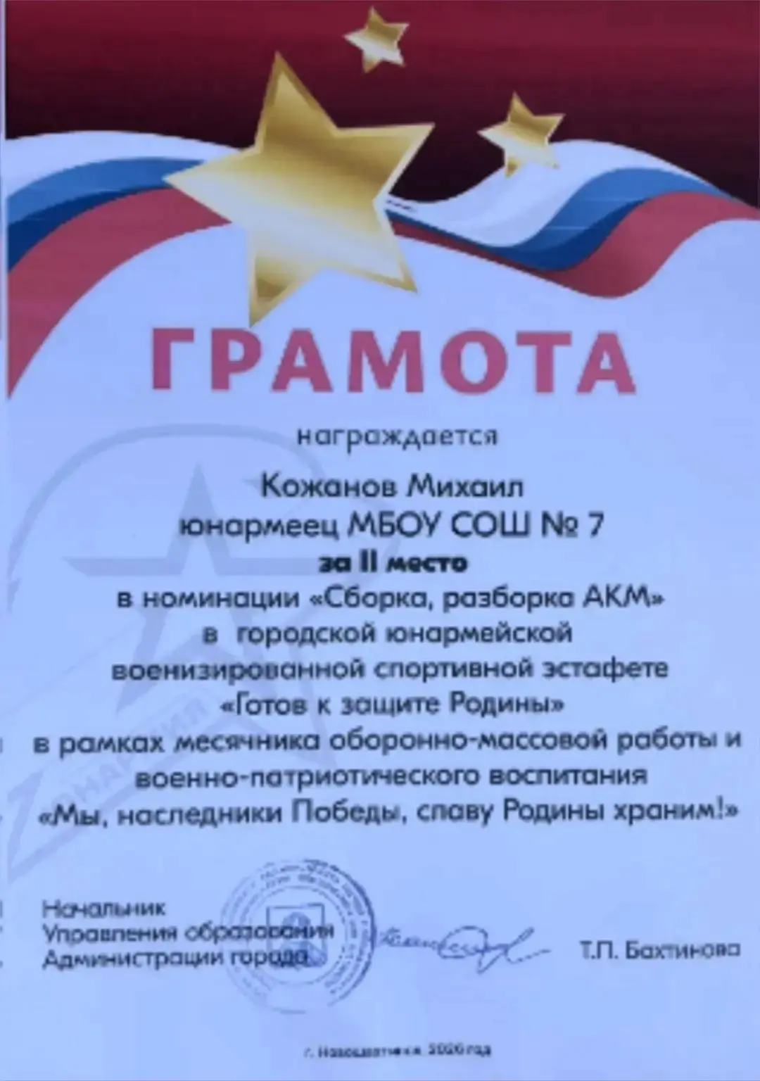 Кожанов Михаил, юнармеец отряда "Патриот" школы №7 награждён грамотой за ll место в номинации "Сборке-разборке АКМ" в городской юнармейской военизированной спортивной эстафете "Готов к защите Родины".