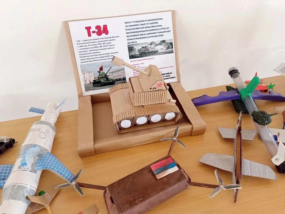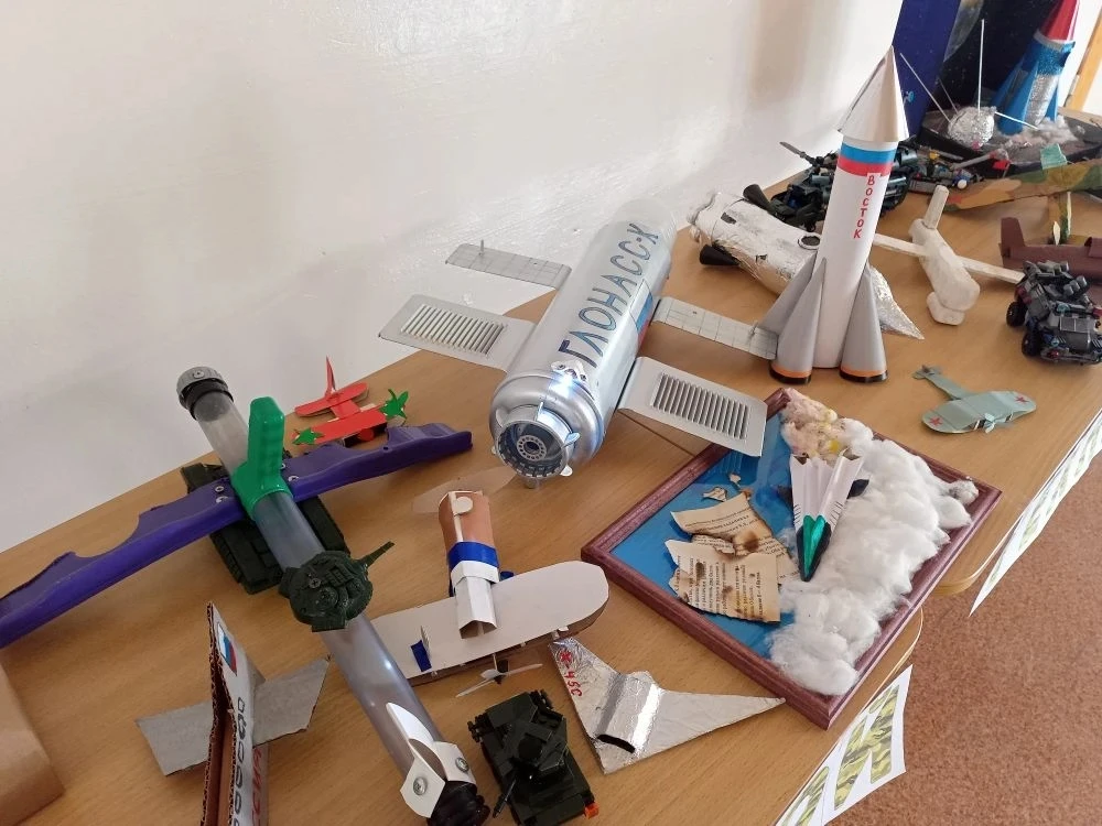 Школьники представили разнообразные макеты военных самолётов, ракет, космических станций, танков, военных машин ПВО, выполненых из различных материалов и конструкторов Лего. Каждая работа вызывает восторг своей оригинальностью и уникальностью!