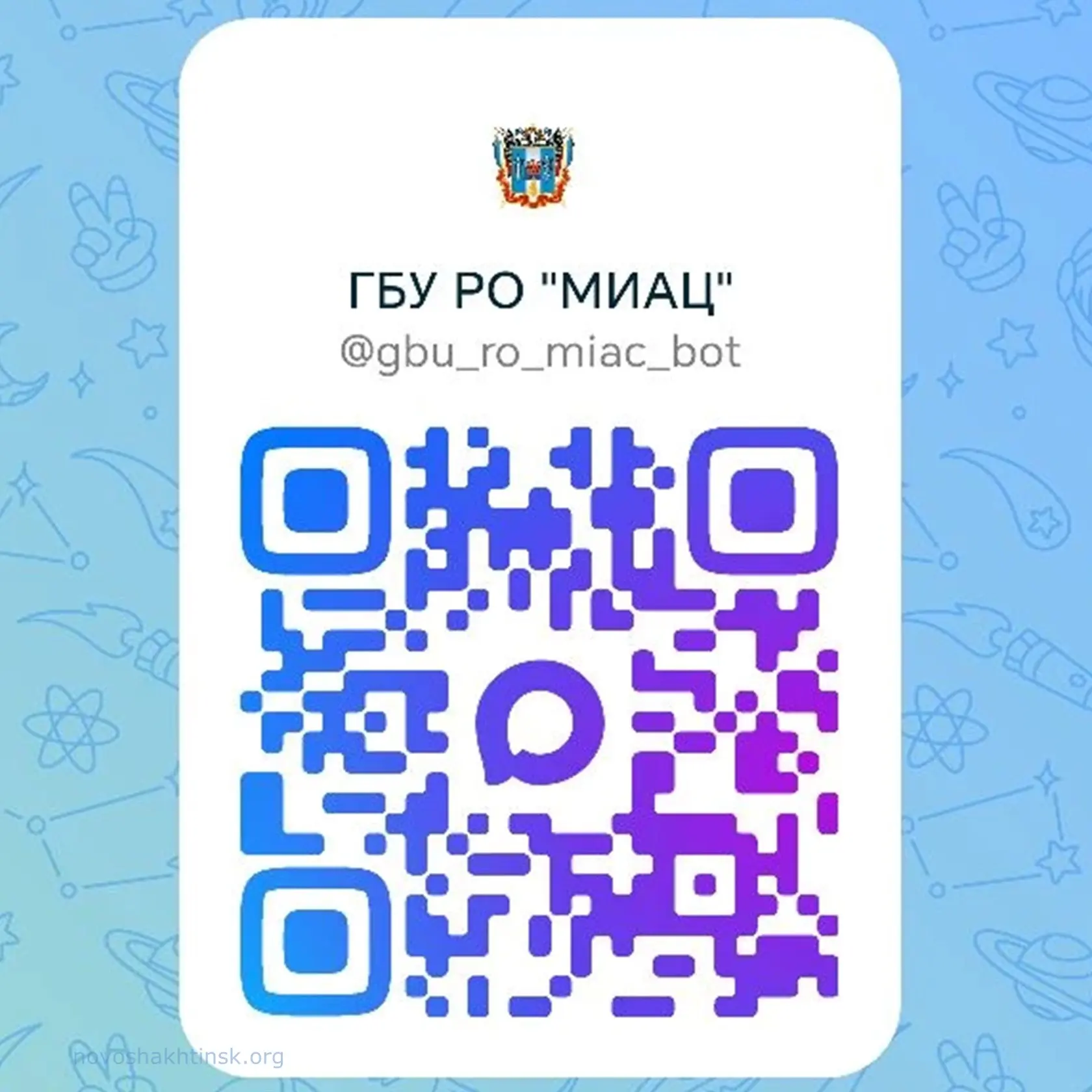 В поисковой строке мессенджера MAX введите — ГБУ РО "МИАЦ" или перейдите по ссылке: https://max.ru/gbu_ro_miac_bot или QR-коду в карточке