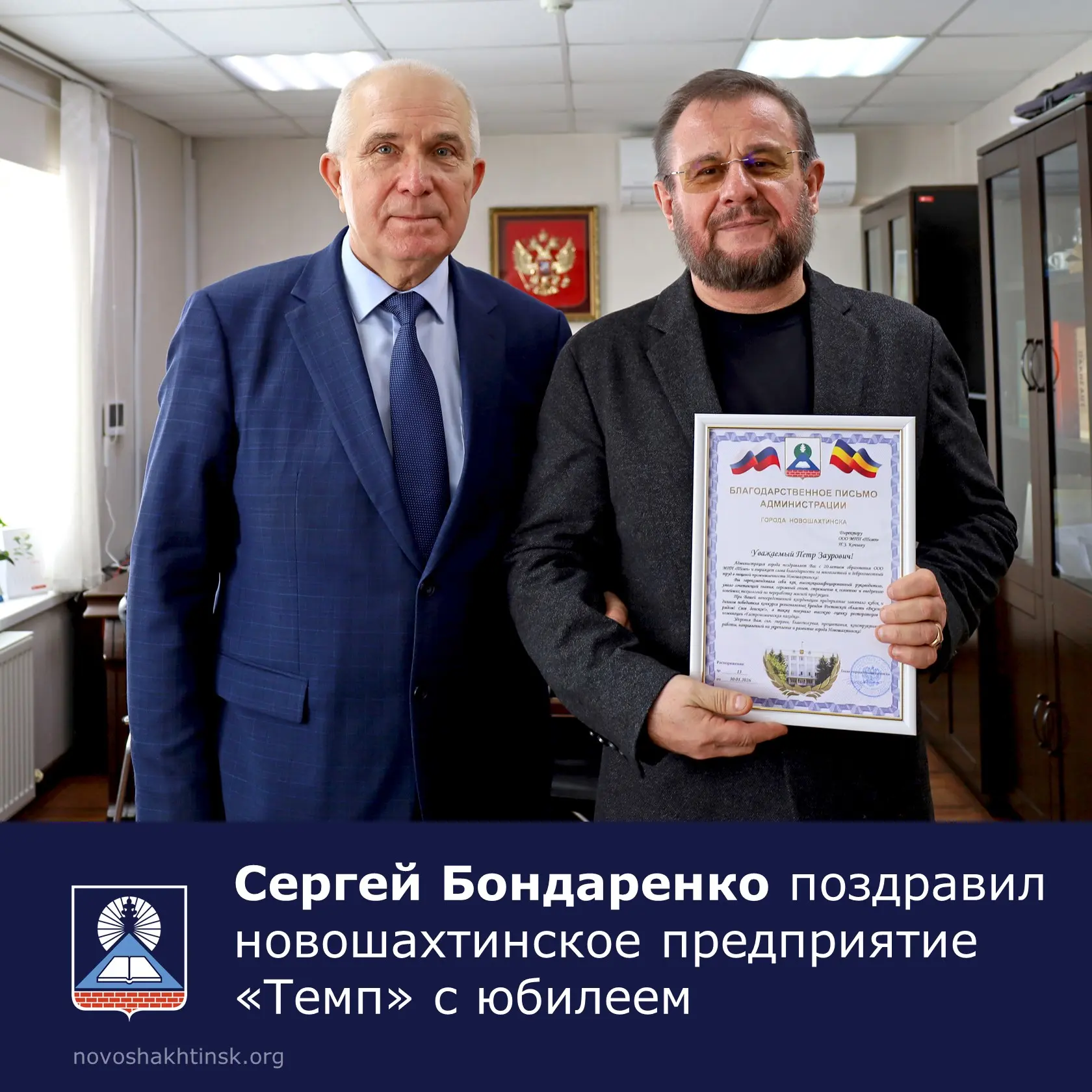 Сергей Алексеевич поздравил руководителя предприятия Петра Кочиева с двадцатилетием компании.