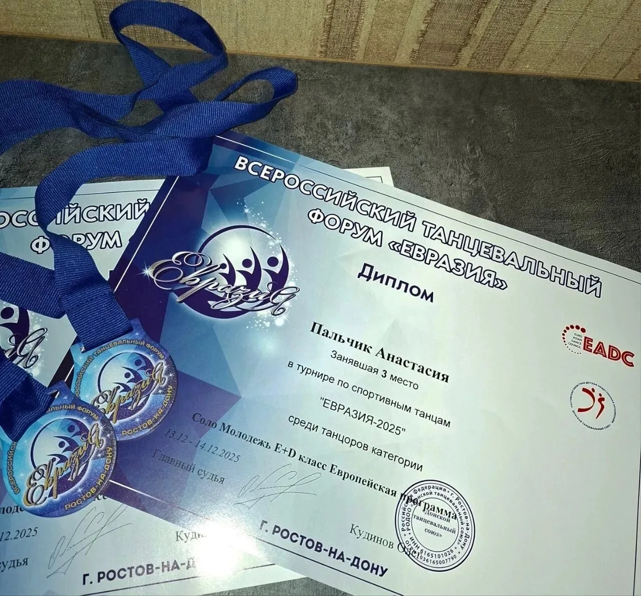 Ученица 11 класса Анастасия Пальчик приняла участие во всероссийском турнире по спортино-бальным танцам "Евразия 2025-2026" Турнир в Ростове-на-Дону собрал более двух тысяч спортсменов и чемпионов из разных городов России. Анастасия показала высокий уровень мастерства и завоевала два третьих места. Поздравляем Анастасию и её тренера с отличным результатом и желаем дальнейших побед!