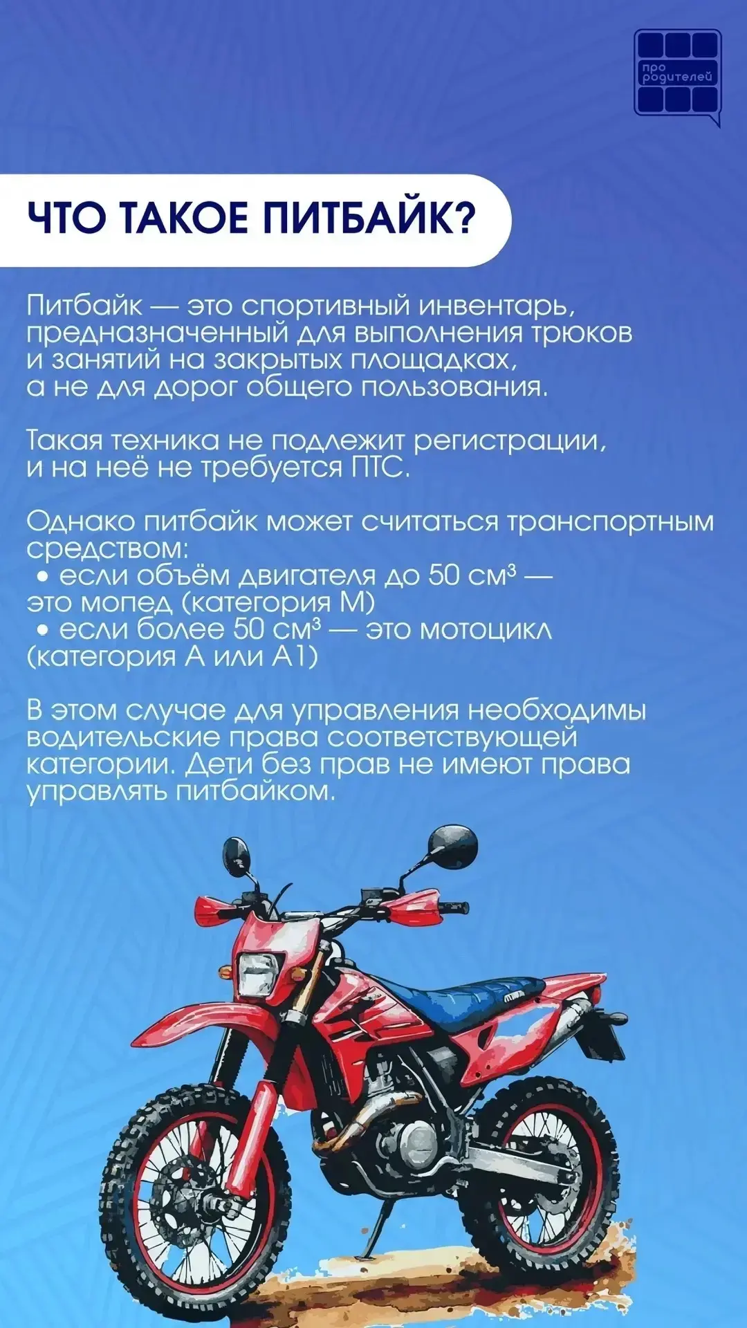 🔹 Лёгкий, быстрый, «как у взрослых» — питбайк всё чаще становится желанным подарком для подростков. Родителям кажется: пусть лучше катается, чем сидит в телефоне. Но здесь важно не перепутать хобби с реальной угрозой. Потому что за этим «безобидным увлечением» могут стоять травмы, серьёзные последствия… и ответственность, о которой многие даже не задумываются.
