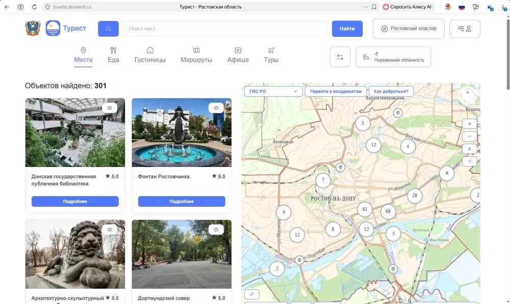Портал предоставляет информацию о достопримечательностях, инфраструктуре и маршрутах региона. По умолчанию отображается информация о Ростове-на-Дону. При загрузке на мобильном устройстве открывается приложение или страница для его установки.