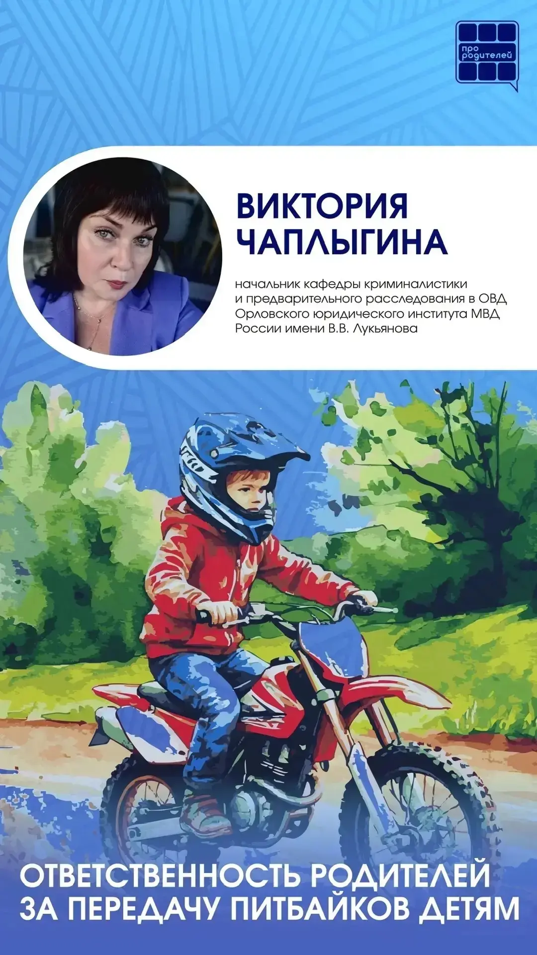 💬 Виктория Чаплыгина, начальник кафедры криминалистики и предварительного расследования в ОВД Орловского юридического института МВД России имени В.В. Лукьянова — подробно объясняет: что такое питбайк с точки зрения закона, где на нём можно ездить, и какую ответственность несут родители и подростки.