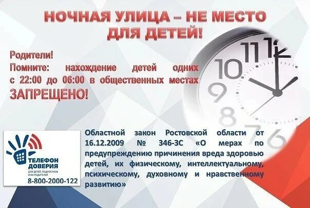 Законом установлено ночное время, когда несовершеннолетним запрещено находиться в общественных местах без сопровождения родителей или лиц, их заменяющих: с 22.00 часов до 06.00 часов следующего дня.