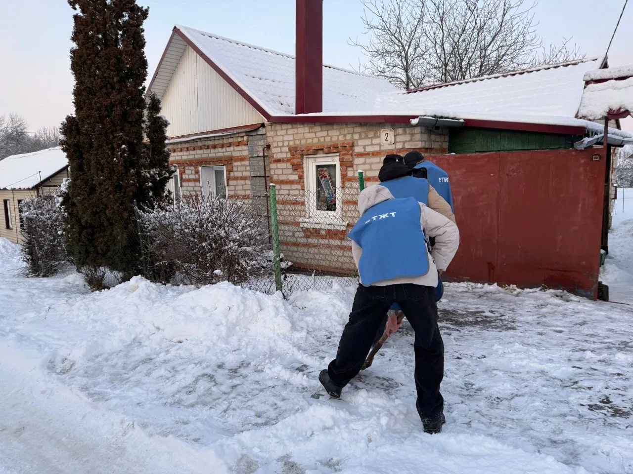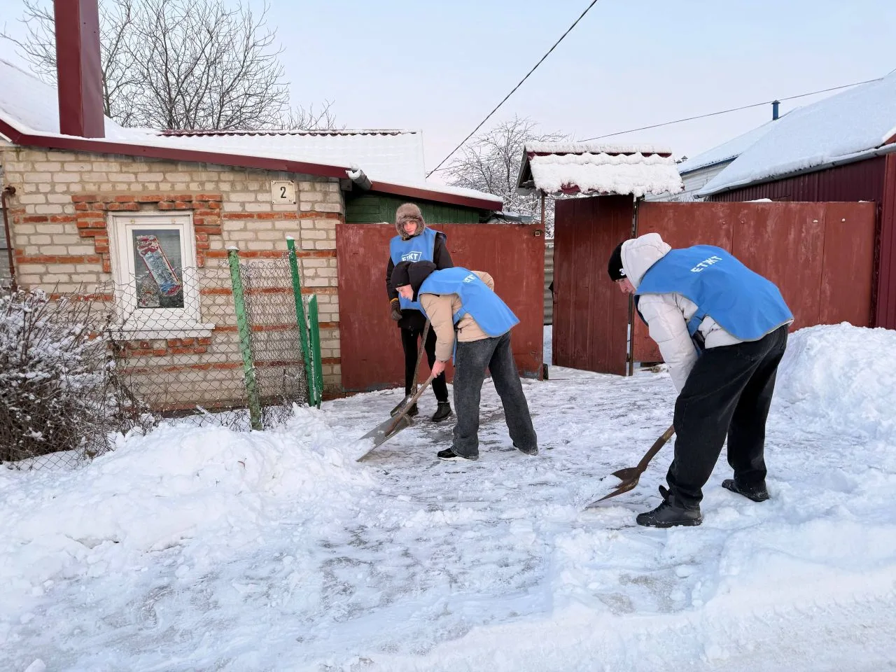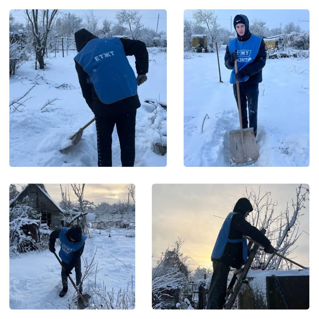 Пожилой одинокой женщине тяжело самостоятельно убирать снег, который еще и покрылся коркой из-за перепадов температуры. Поэтому здесь высадился "Снежный десант".