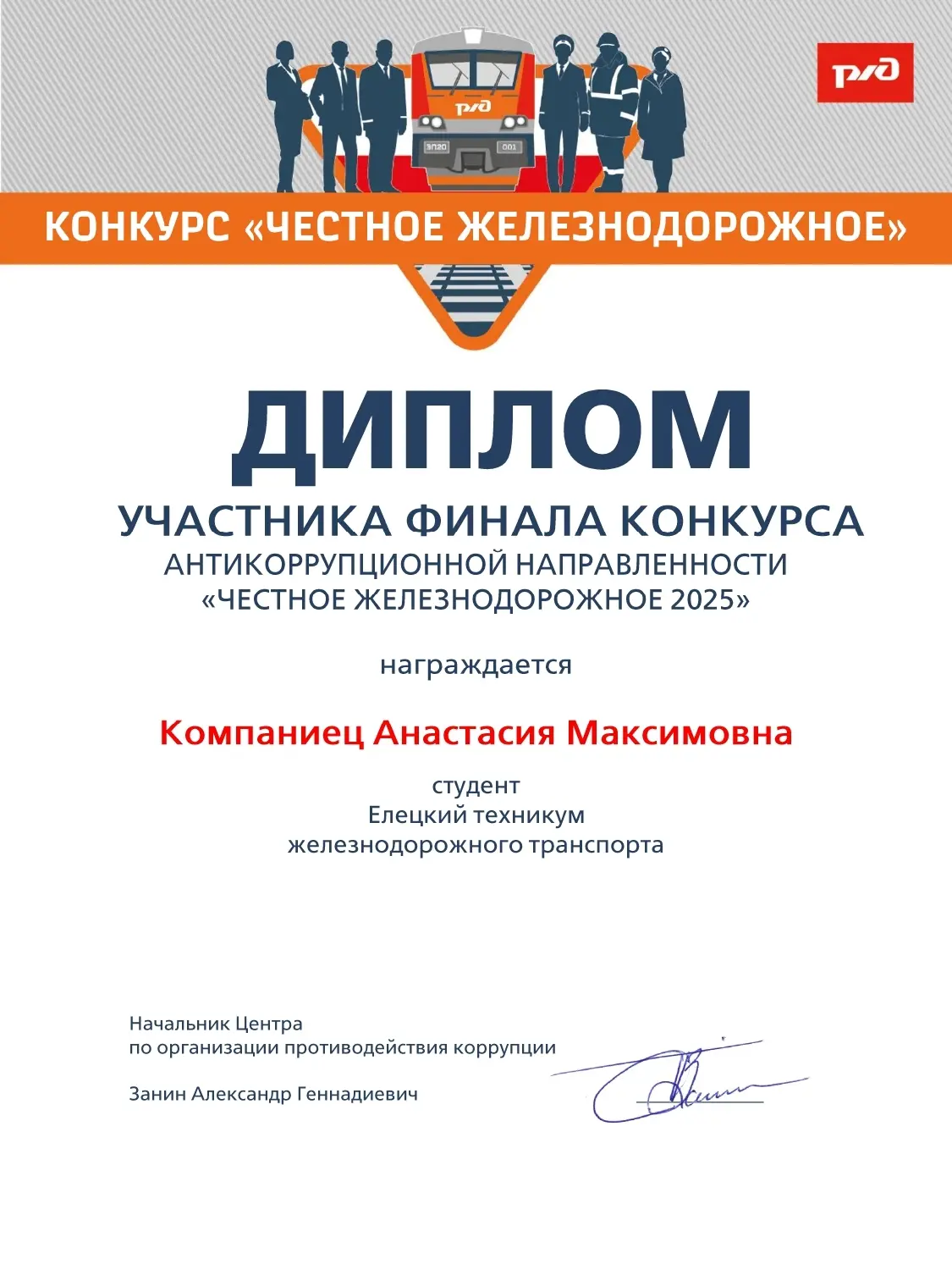 ‼В холдинге ОАО «РЖД» состоялся конкурс, посвященный антикоррупционной направленности «Честное железнодорожное». В данном конкурсе приняли участие работники РЖД, студенты отраслевых вузов и техникумов, в том числе и студенты ЕТЖТ-филиал РГУПС.