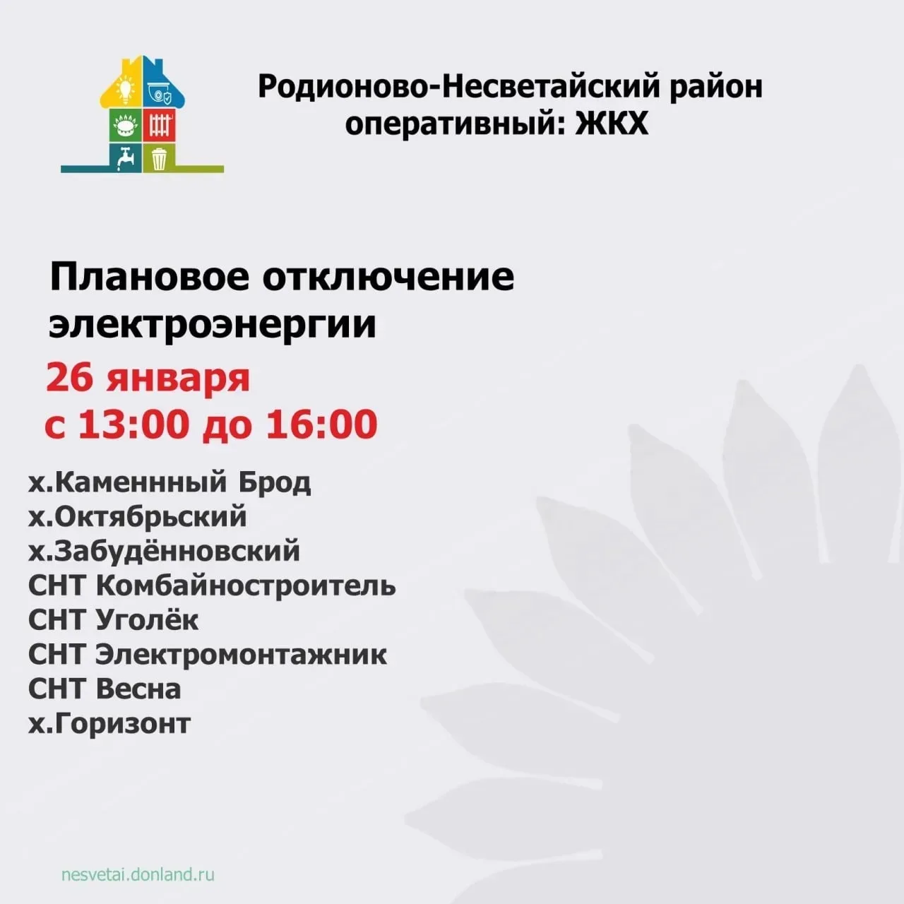 Уважаемые садоводы. В понедельник 26 .01.2026г будет отключение электроэнергии с 13.00 до 16.00