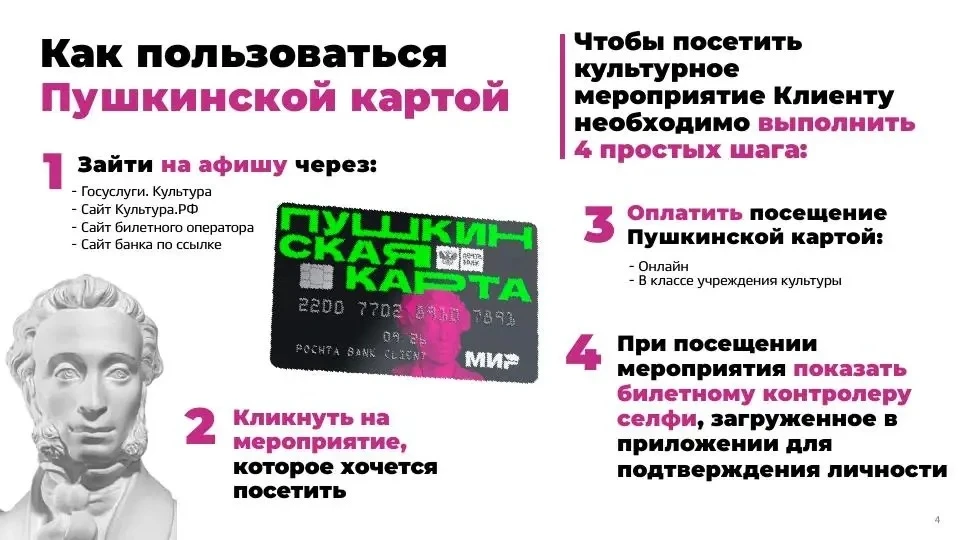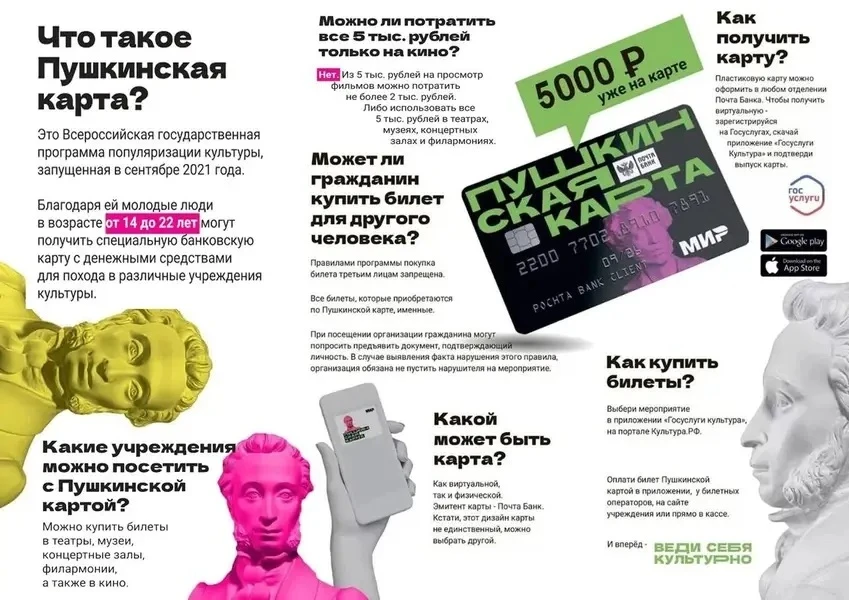 🎭 «Пушкинская карта» — это специальная банковская карта, созданная для молодых людей в возрасте от 14 до 22 лет и призванная повысить их интерес к культурно-просветительским мероприятиям. Владельцам карты один раз в год поступает 5 тысяч рублей от государства. Их можно потратить на любые культурные мероприятия по всей России, которые несут в себе, помимо развлекательной, еще и образовательную функцию.