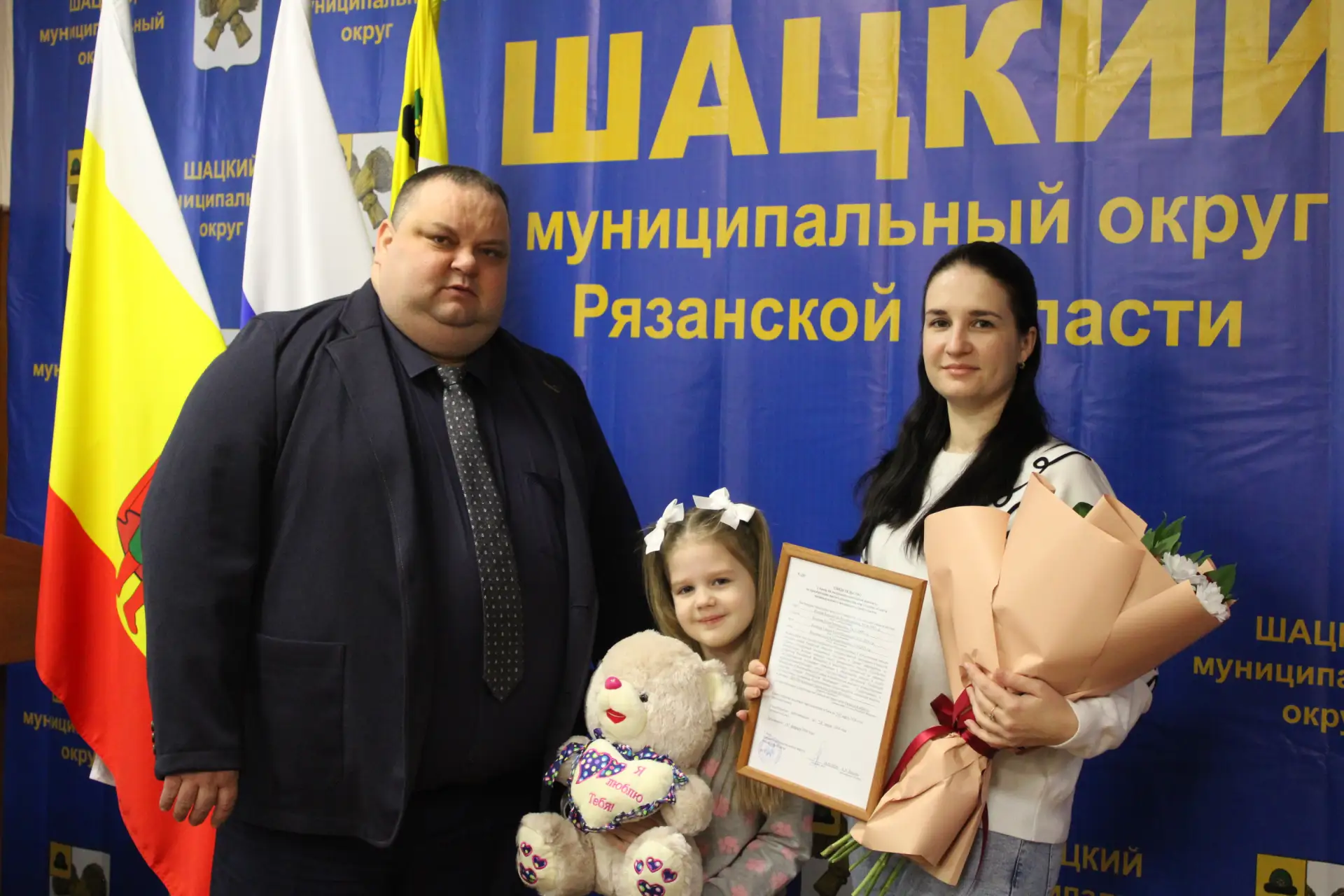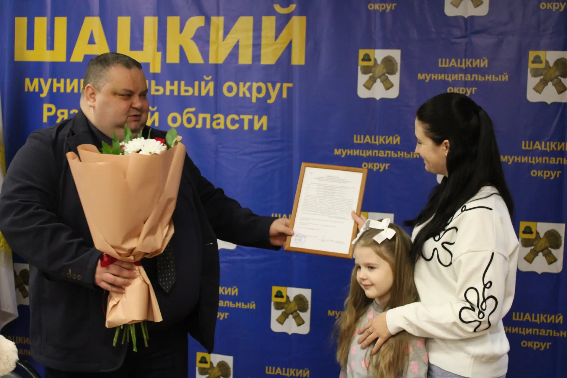 Глава Шацкого округа Яныкин А.Н. торжественно вручил Волковой Юлии Михайловне свидетельство на получение социальной выплаты, так как семья Волковых в составе 4 человек является участницей направления подпрограммы «Обеспечение жильем молодых семей Рязанской области» государственной программы Рязанской области «Реализация молодежной политики».