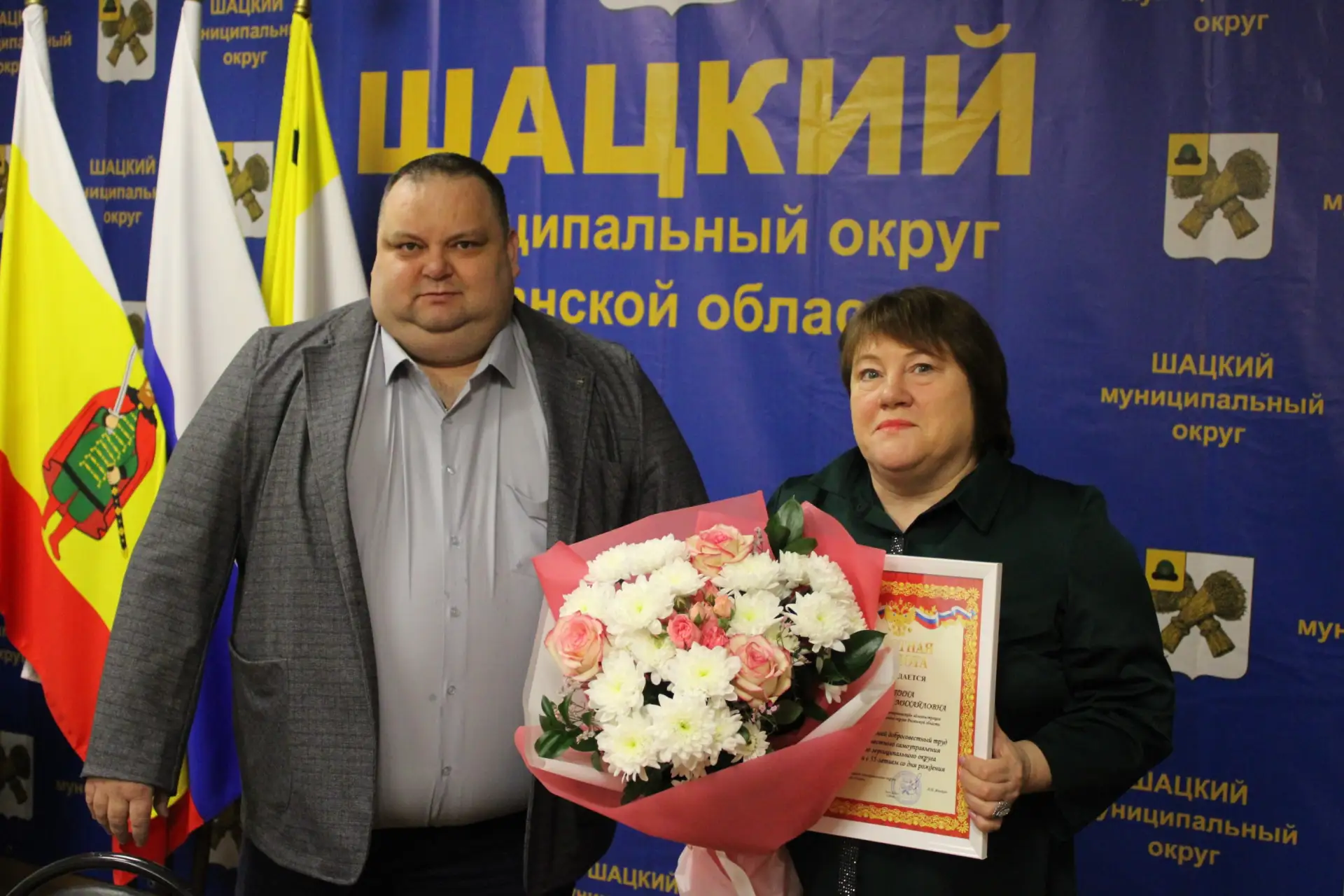 Признанием заслуг Мазяевой Г.Н. стала Почетная грамота, которую вручил сегодня глава Шацкого муниципального округа Яныкин Алексей Николаевич.
