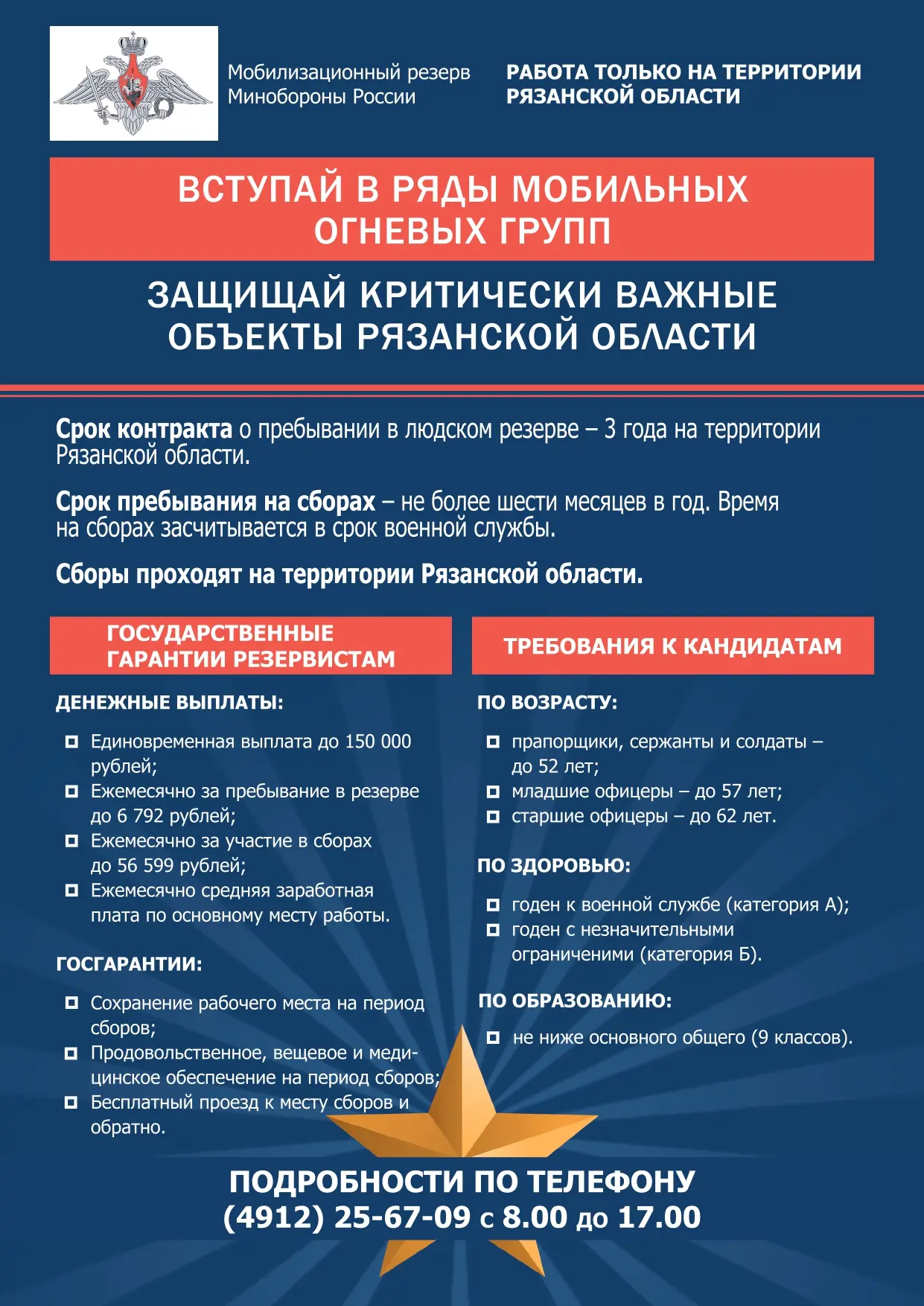Контракт заключается на один год, при этом рабочее место сохраняется. Узнать подробнее — в пункте отбора по адресу: Рязань, улица Каширина, 1. Телефон: 8 (4912) 25-96-99.
