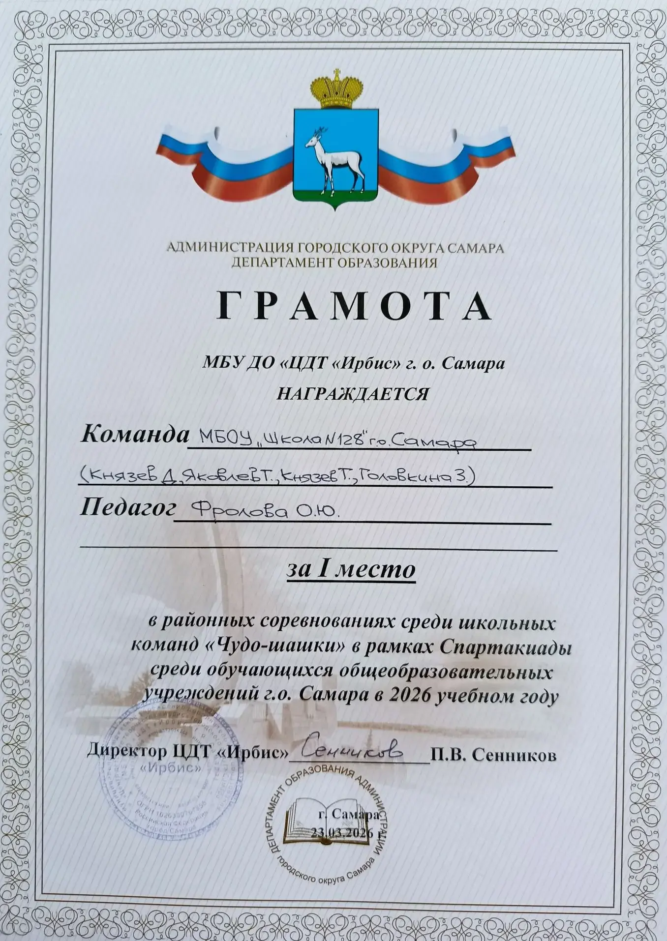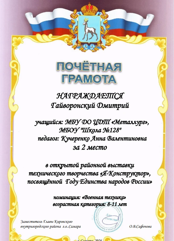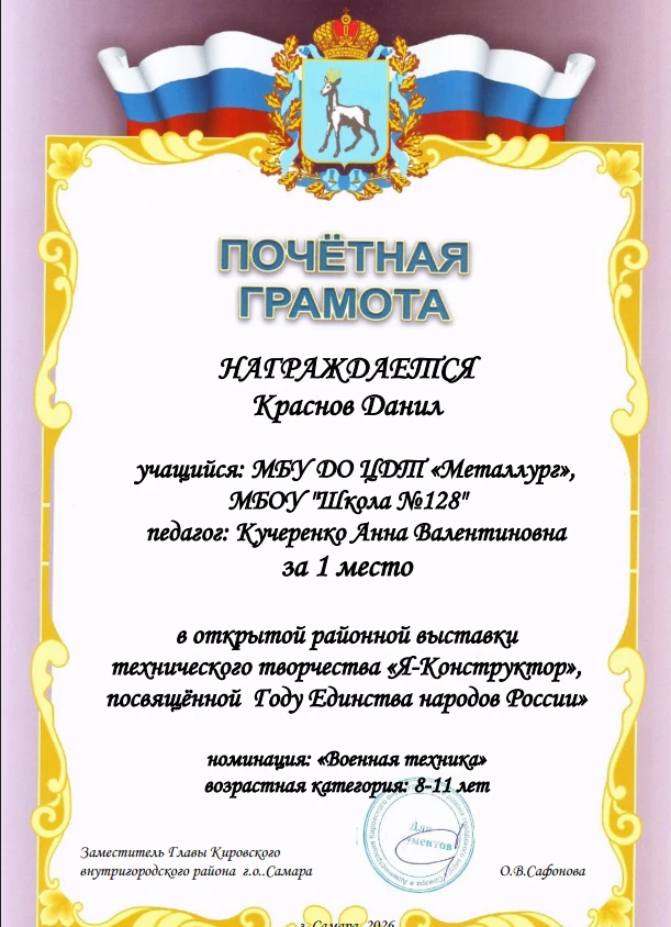 Поздравляем обучающихся МБОУ «Школа №128» городского округа Самара с блестящей победой в открытой районной выставке технического творчества «Я — Конструктор», посвящённой Году Единства народов России!
