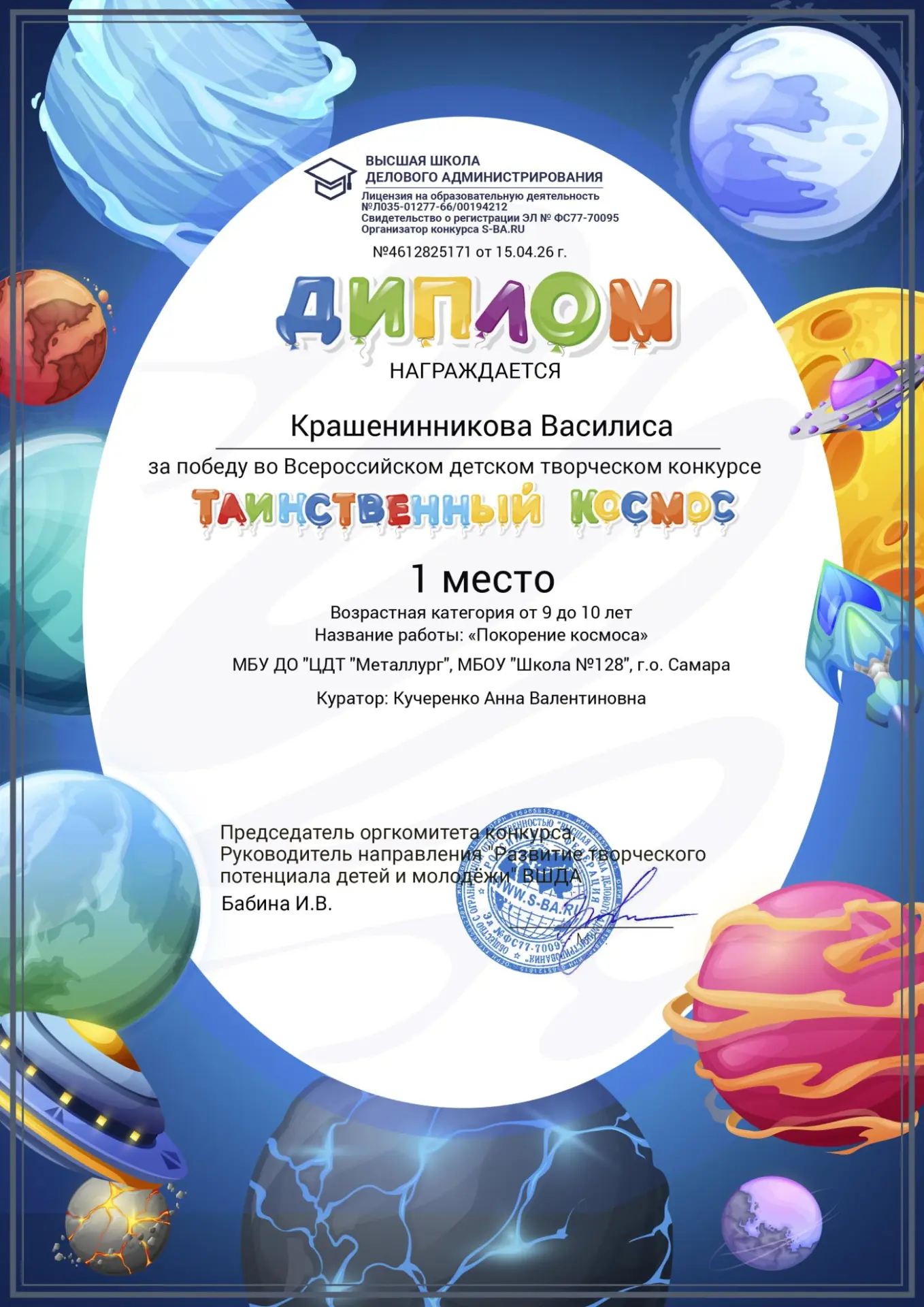 От всей души поздравляем обучающегося 3А класса МБОУ «Школа №128» города Самара Салдаева Евгения с заслуженной победой!