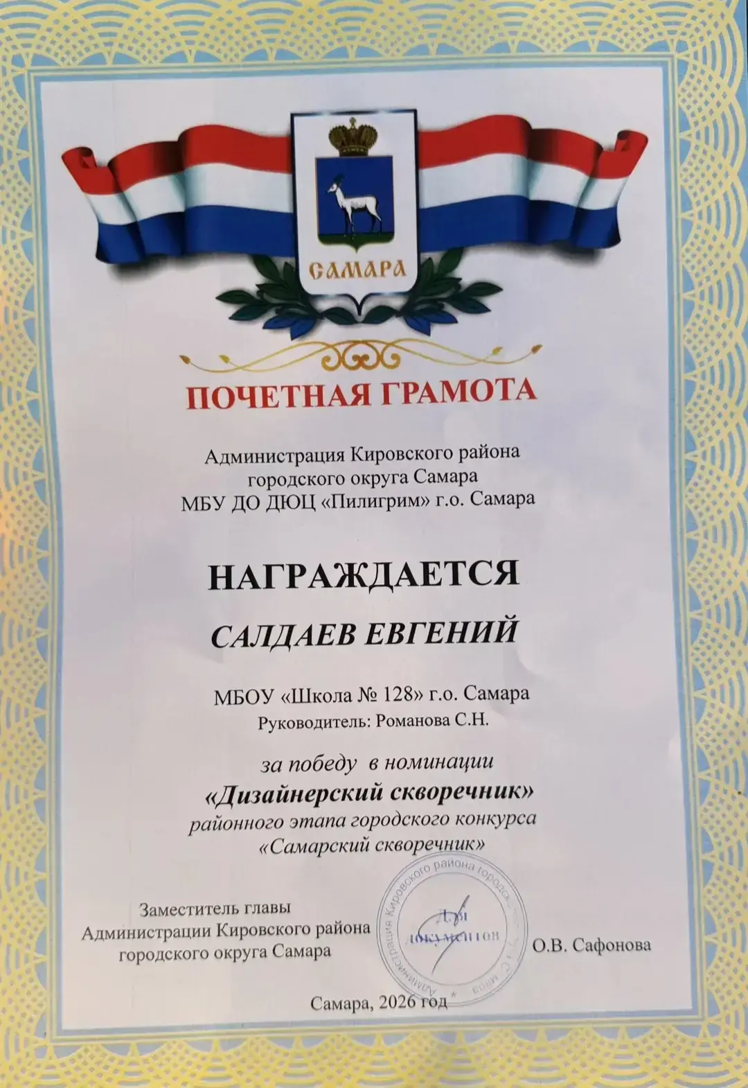🎉 ПОЗДРАВЛЯЕМ ПОБЕДИТЕЛЯ РАЙОННОГО ЭТАПА ГОРОДСКОГО КОНКУРСА «САМАРСКИЙ СКВОРЕЧНИК» В НОМИНАЦИИ «ДИЗАЙНЕРСКИЙ СКВОРЕЧНИК»! 🌟