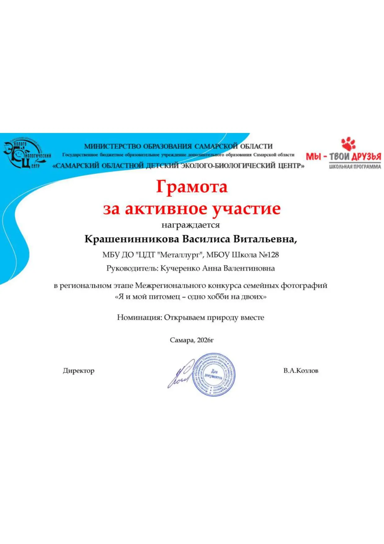 С радостью сообщаем, что наши воспитанники получили почётные грамоты за активное участие в региональном этапе Межрегионального конкурса семейных фотографий «Я и мой питомец — одно хобби на двоих».